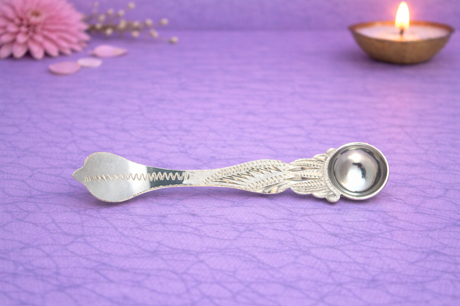 Expertly manufactured in 14KT silver purity, the Aachmani features a natural silver finish that preserves its authentic handcrafted appeal while ensuring durability and suitability for regular ritual use. The balanced proportions and smooth contours make it comfortable to handle, allowing precise and respectful use during sacred rituals.