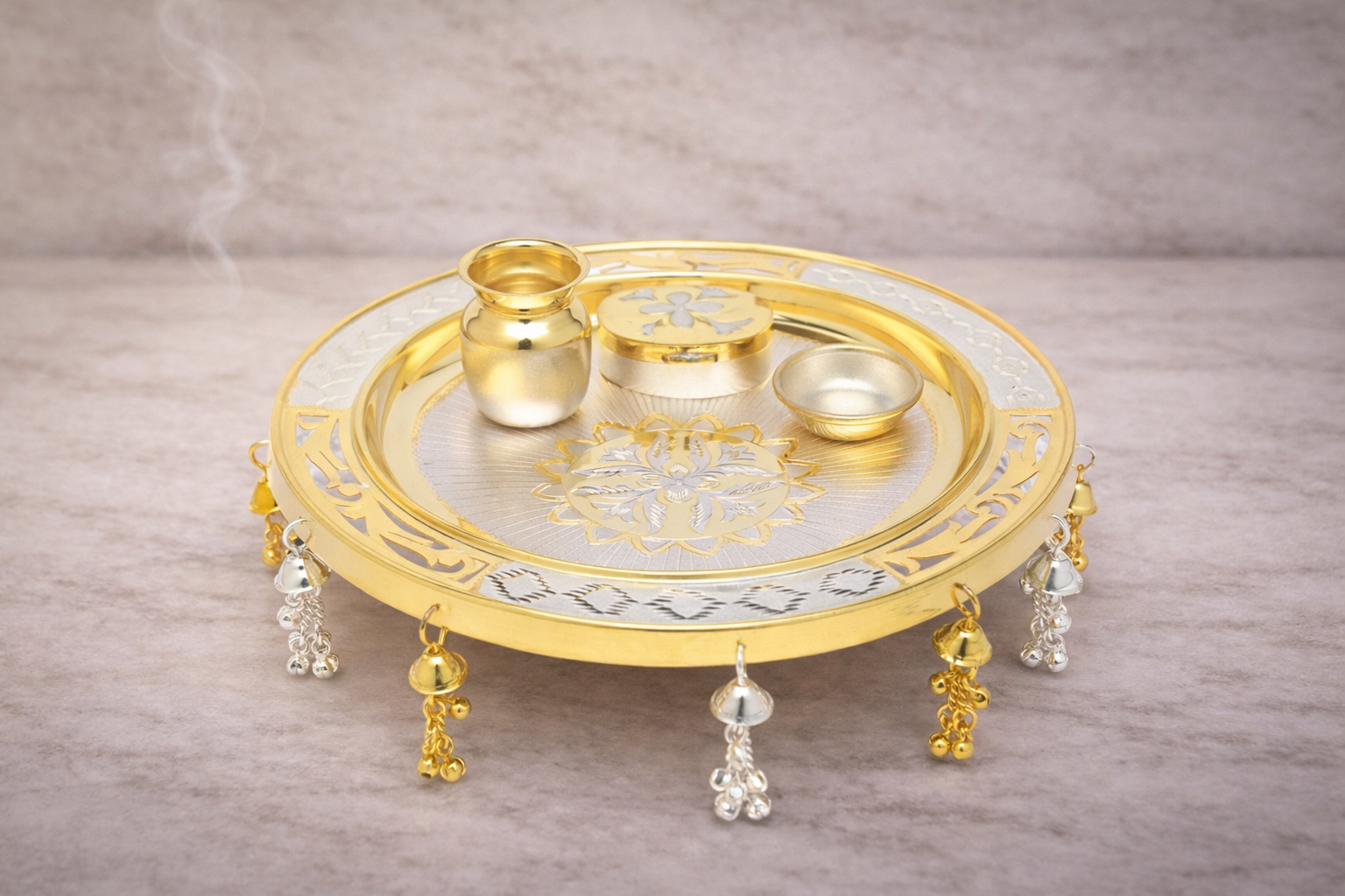 Expertly manufactured in 19KT silver purity with a refined dual-tone silver and gold finish, the aarti set showcases intricate engraved patterns that add depth and visual appeal while ensuring durability and long-lasting shine. The well-balanced components are thoughtfully designed for ease of use during daily aarti, special poojas, and festive ceremonies.