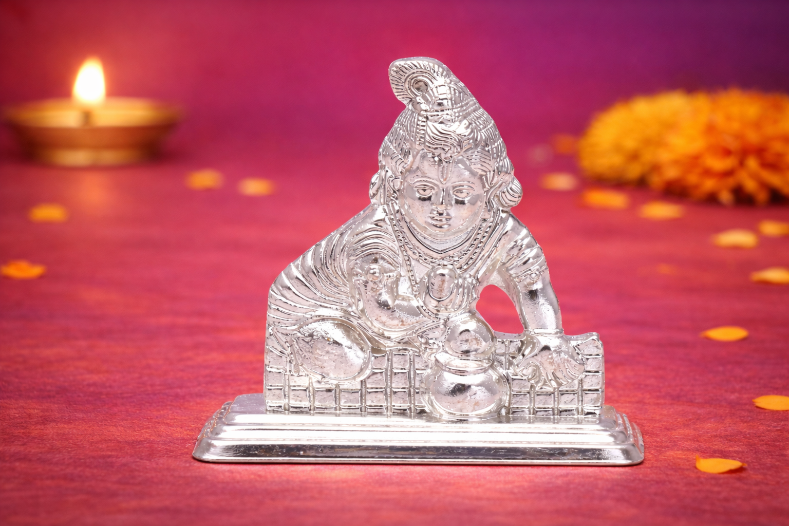 Crafted using the casting technique, the idol features finely defined facial expressions, balanced proportions, and intricate detailing across the ornaments, posture, and base. Made in 16KT silver purity, it carries a natural silver finish with authentic metallic shine, preserving devotional sanctity without any artificial enhancement.