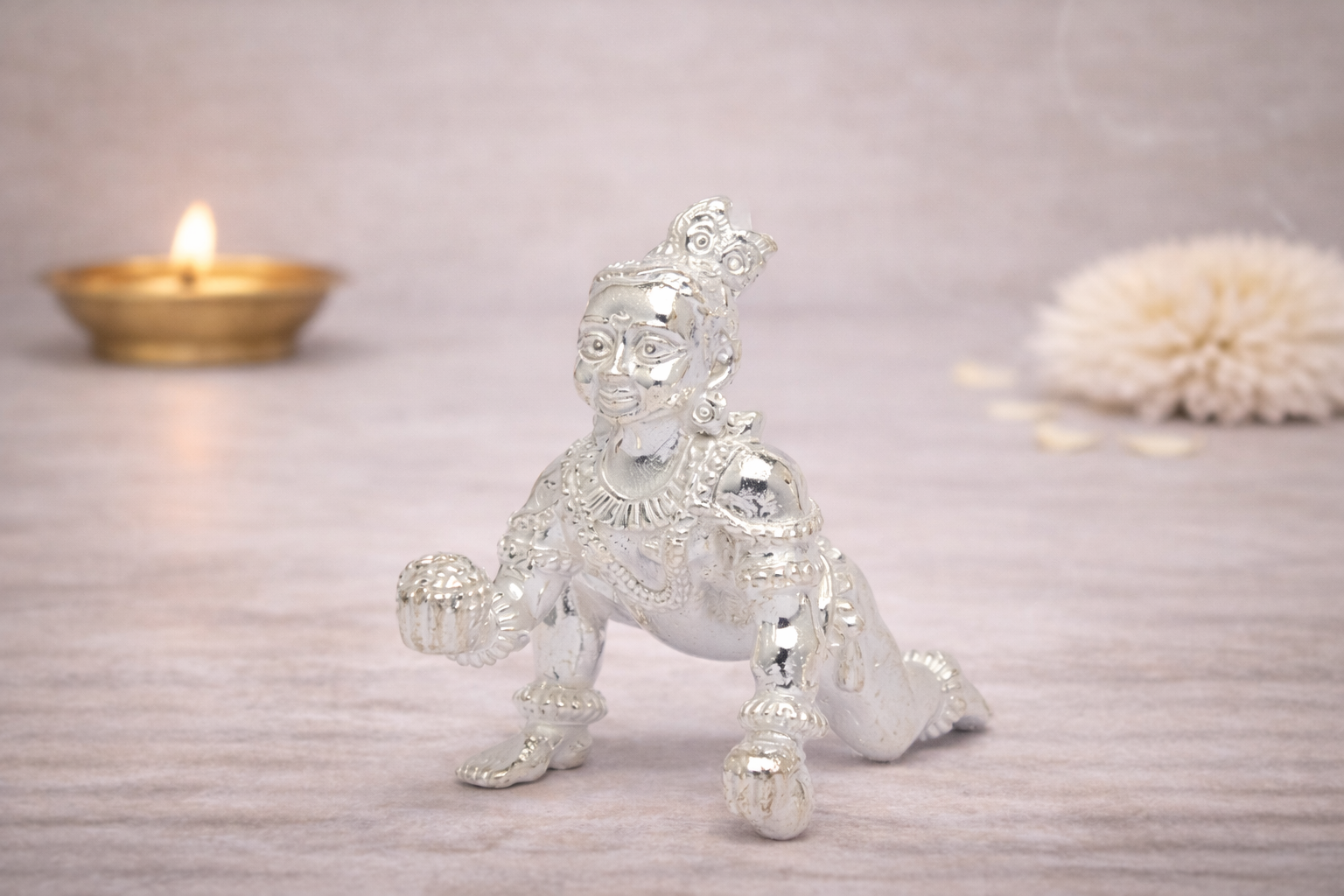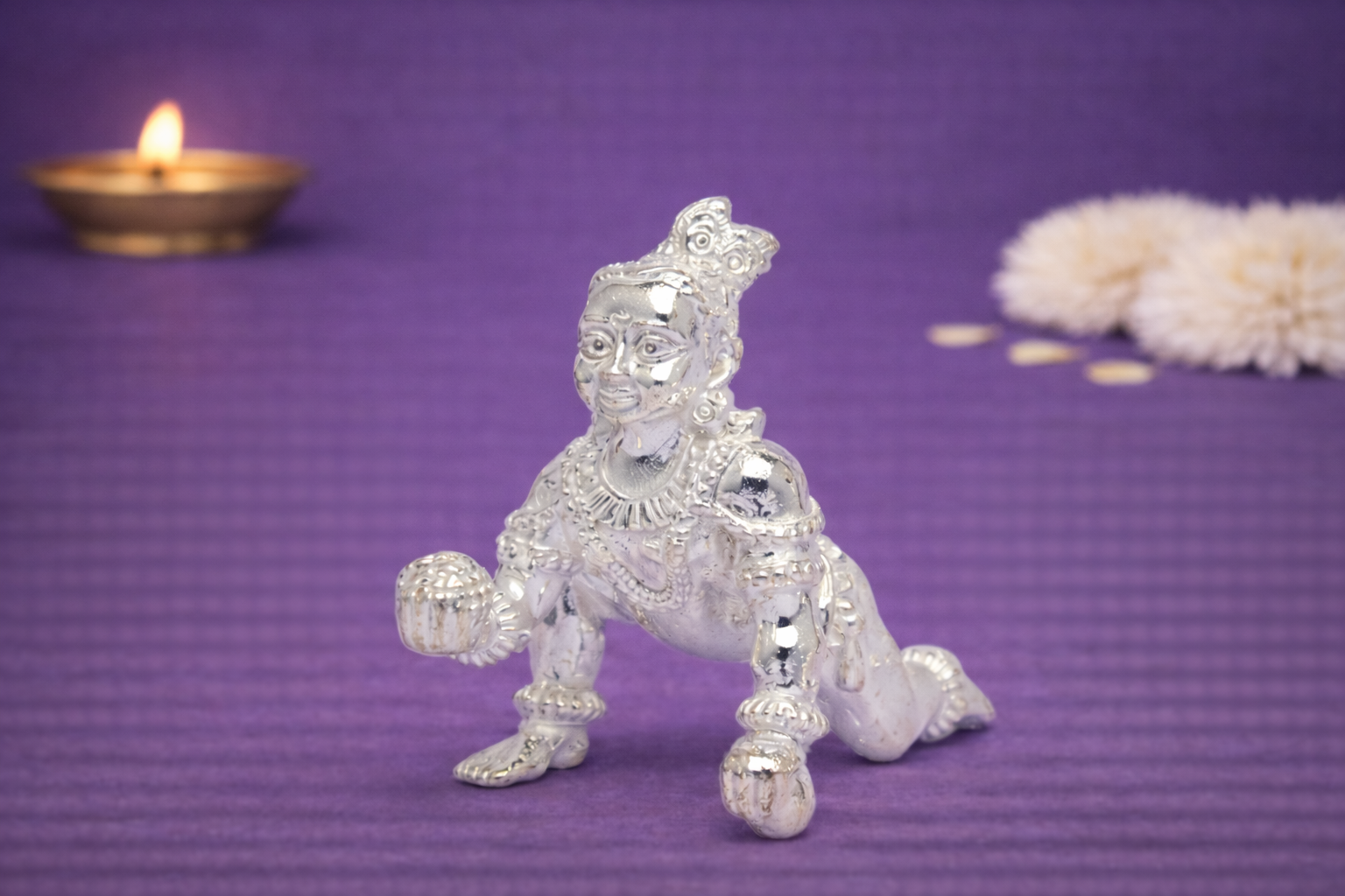 The Bal Krishna Solid Idol is a beautifully crafted silver idol that captures the playful innocence and divine charm of Lord Krishna in his childhood form. Depicted in a crawling posture with expressive detailing, this idol symbolizes joy, purity, and divine protection, making it an auspicious addition to any pooja space or sacred corner.