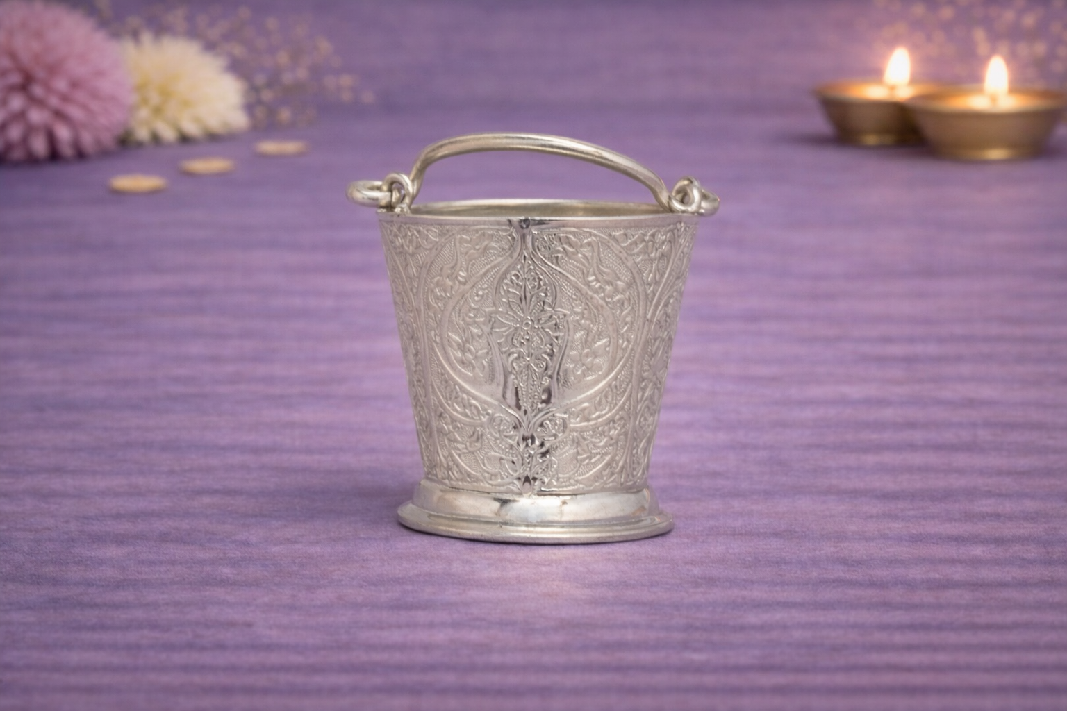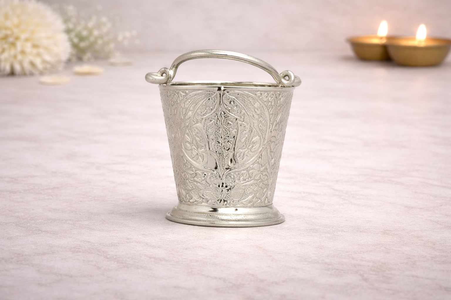 The Balti Silver Bucket is an exquisitely crafted religious accessory from the Nathdwara Items Collection, designed for ritual use in temple worship and traditional seva practices. Featuring finely engraved floral and ornamental motifs, this balti reflects refined silver craftsmanship while maintaining a compact, functional form suitable for ceremonial use.