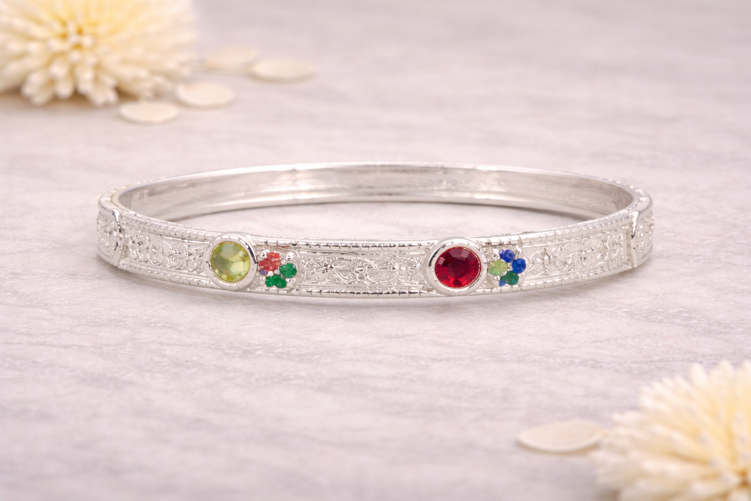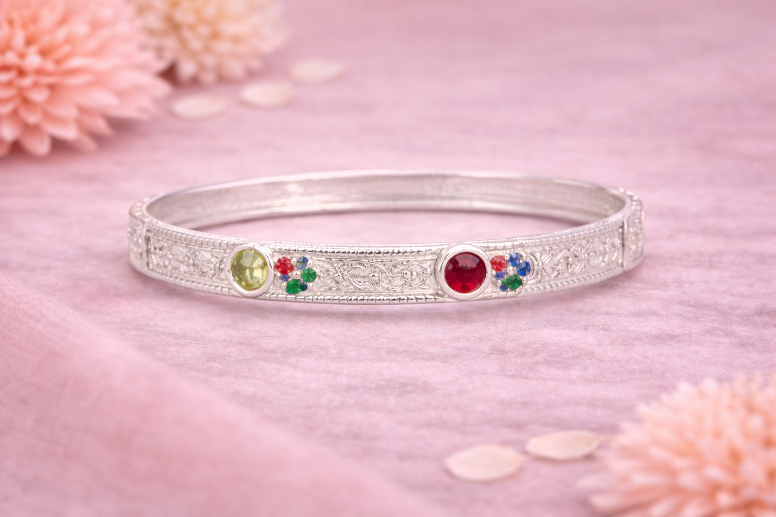 The Bangles D from our Women’s Collection is a refined silver bangle designed to blend traditional craftsmanship with subtle contemporary detailing. Crafted to sit comfortably on the wrist, this bangle reflects classic Indian jewellery aesthetics while remaining suitable for everyday and festive wear.