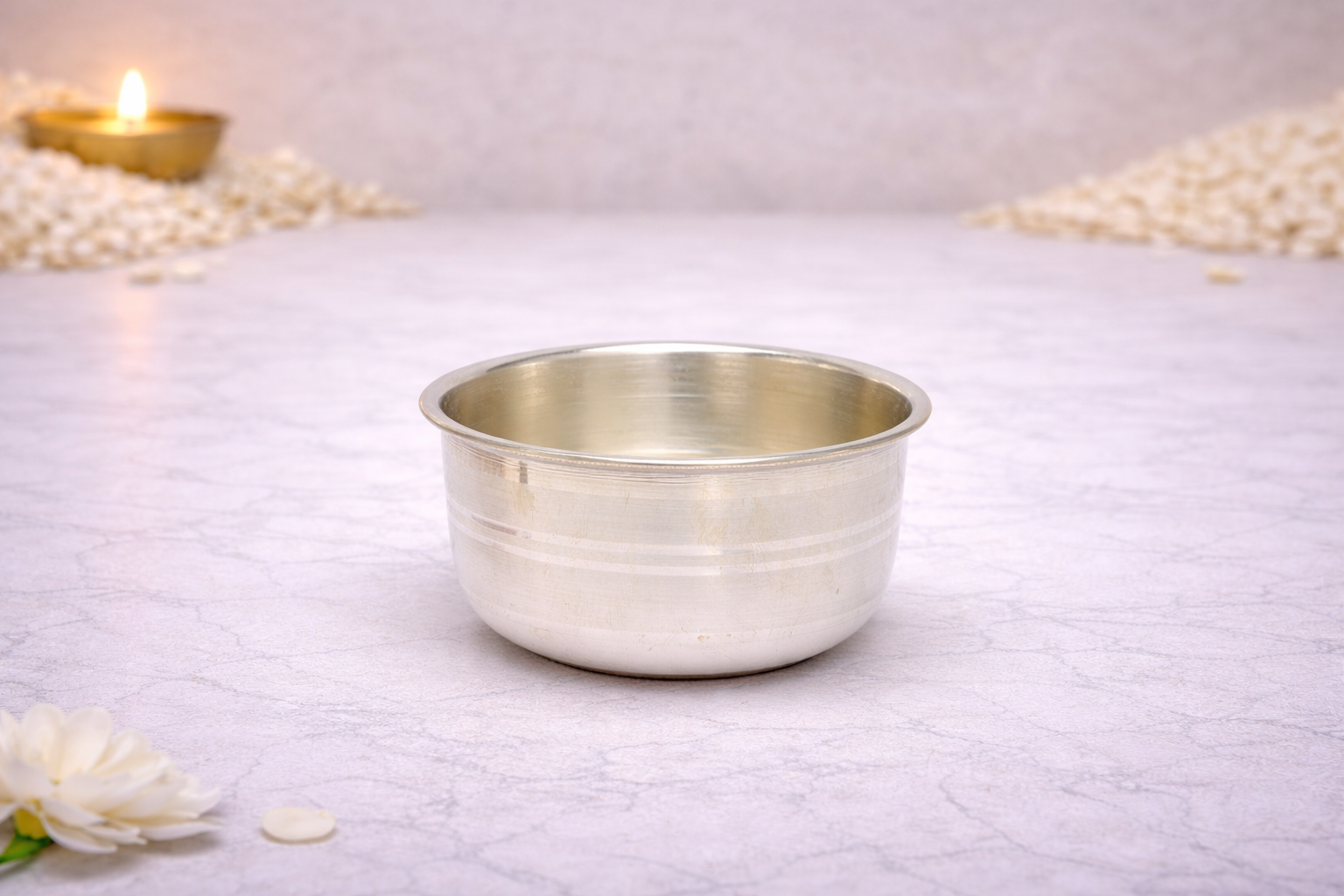 Crafted with precision and simplicity, the Biding Vati is a classic pure silver bowl designed for everyday household and ceremonial use. Its smooth cylindrical form with subtle horizontal banding reflects timeless Indian craftsmanship, making it both functional and elegant. The balanced proportions and refined finish ensure ease of use while enhancing the aesthetic of your dining or pooja setup.