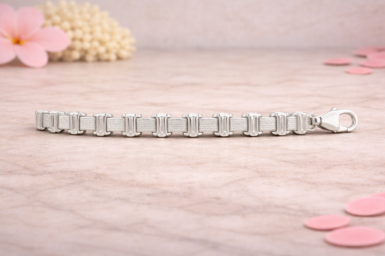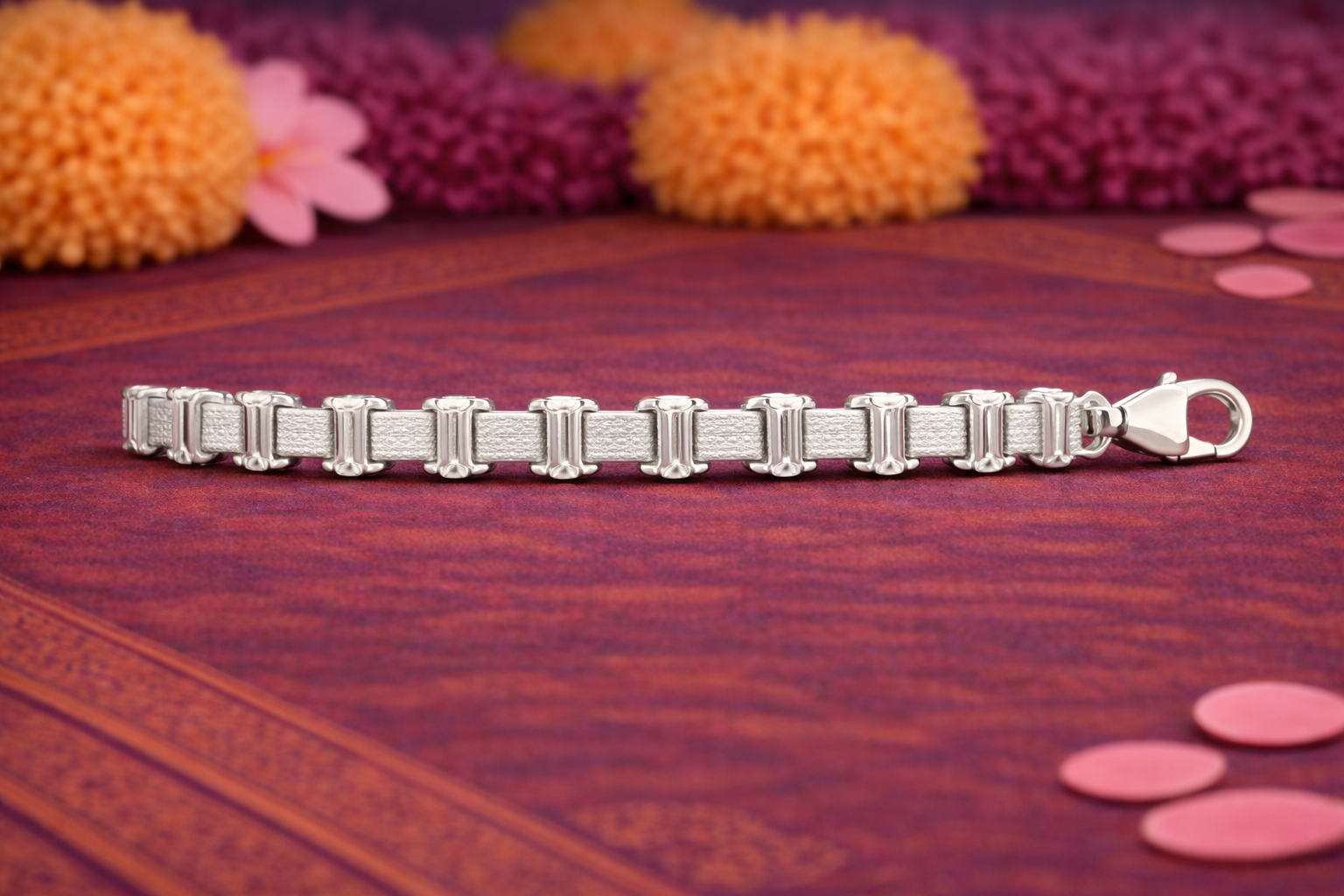Crafted in 16KT silver purity, this bracelet showcases a natural silver finish that enhances the depth and detailing of each precisely formed segment. The solid construction ensures durability and long-lasting wear, while the smooth edges provide comfort on the wrist, making it suitable for regular use as well as special occasions.