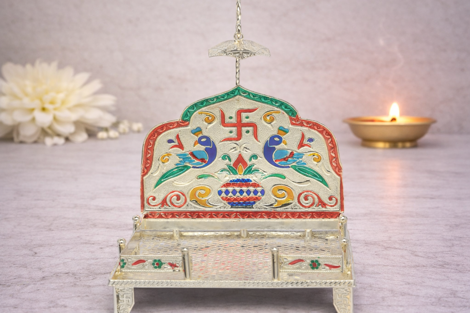 The Choras Sinhasan Silver Chowki is a finely crafted Nathdwara-style religious seating platform, traditionally used for placing idols during daily worship, festive rituals, and ceremonial decorations. Designed with classic choras form and ornate backrest detailing, this sinhasan reflects traditional temple artistry and devotional aesthetics, making it ideal for Shrinathji seva, home mandirs, and religious displays.