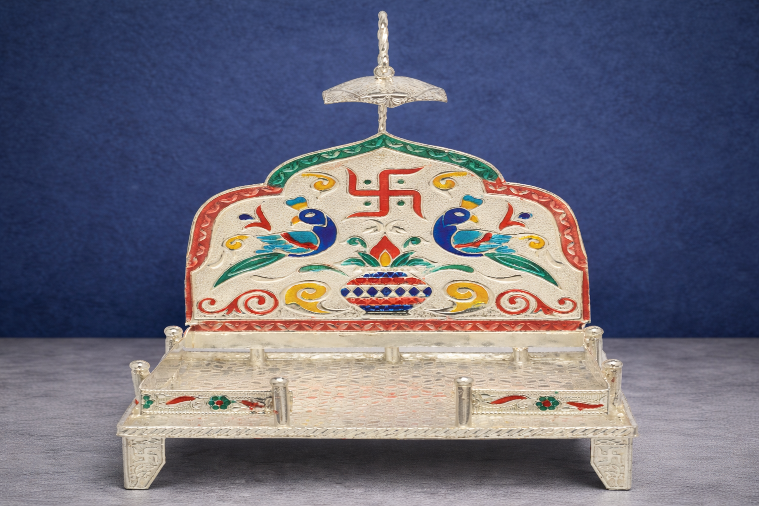 Crafted in 16KT silver, the sinhasan features precise hand detailing, engraved motifs, and a stable elevated structure to support idols securely. The solid construction ensures durability and long-term use, while the refined silver finish maintains its sacred and traditional appeal. Its balanced proportions make it suitable for both permanent mandir setups and special occasion placements.