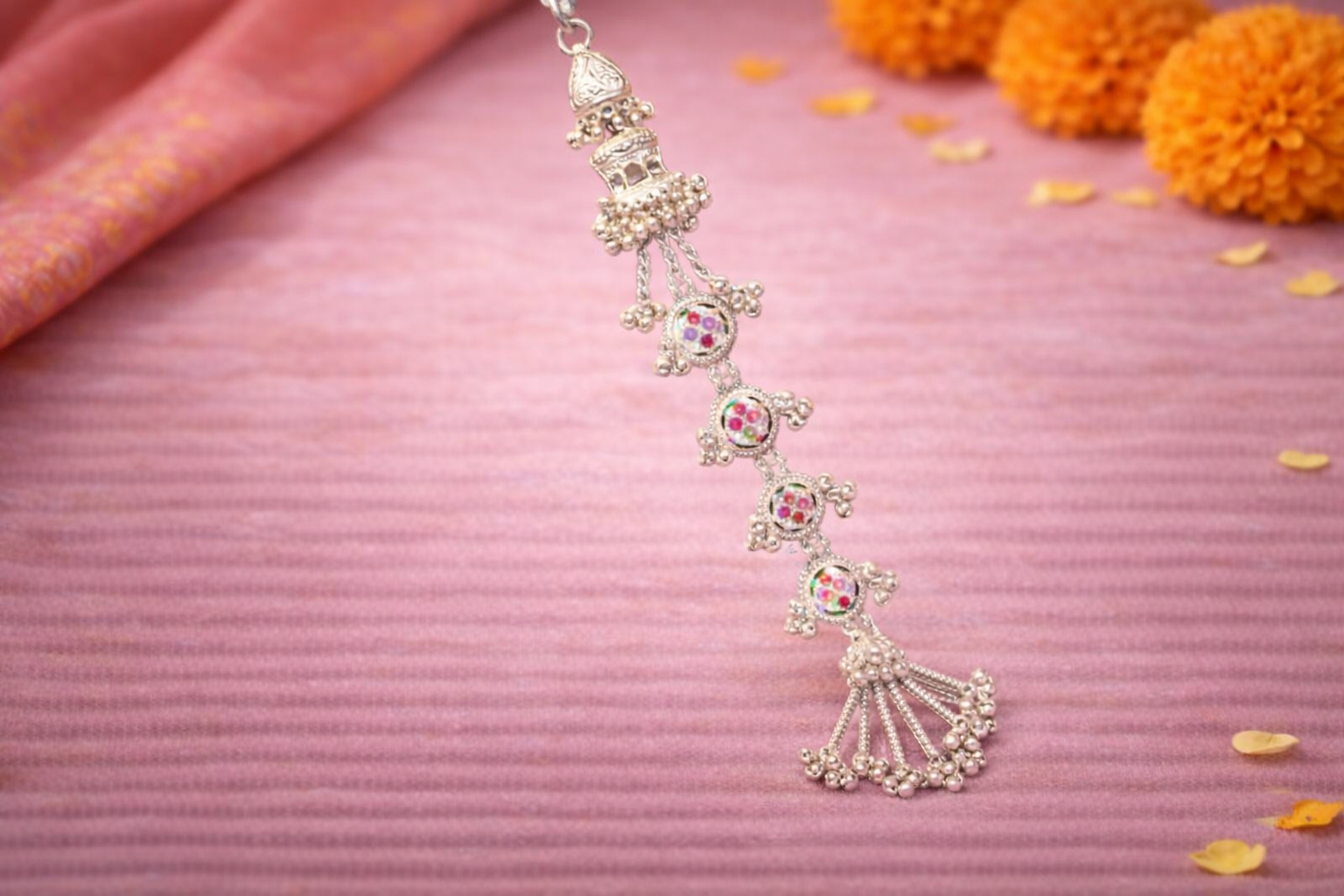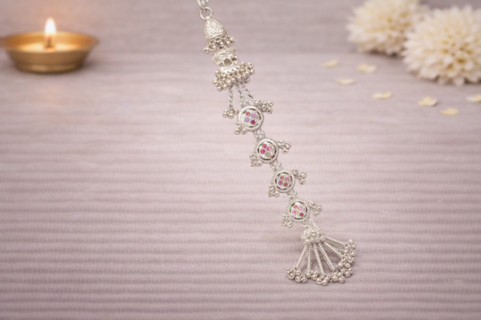 The Chotla A from our Women’s Collection is a beautifully crafted traditional silver hair ornament designed to enhance classic and festive hairstyles with understated elegance. Traditionally worn along the hair parting or braid, this Chotla reflects rich Indian jewellery heritage while remaining graceful and wearable.