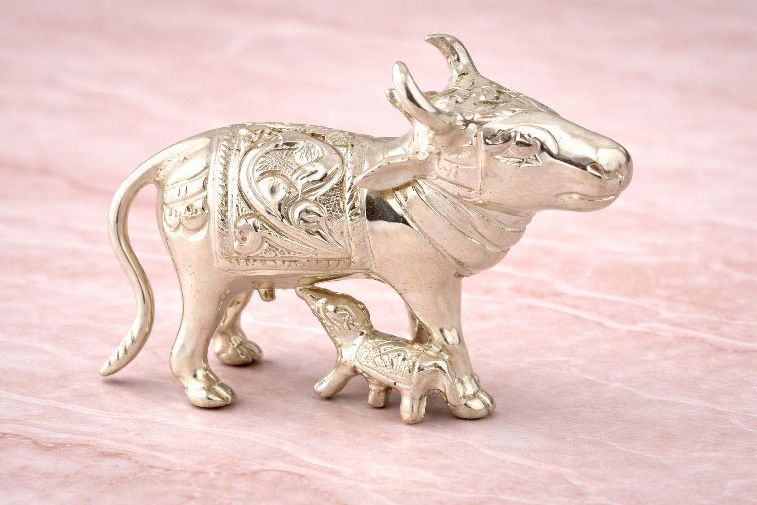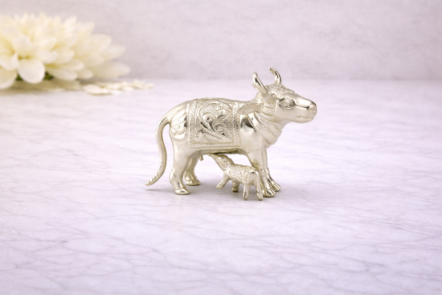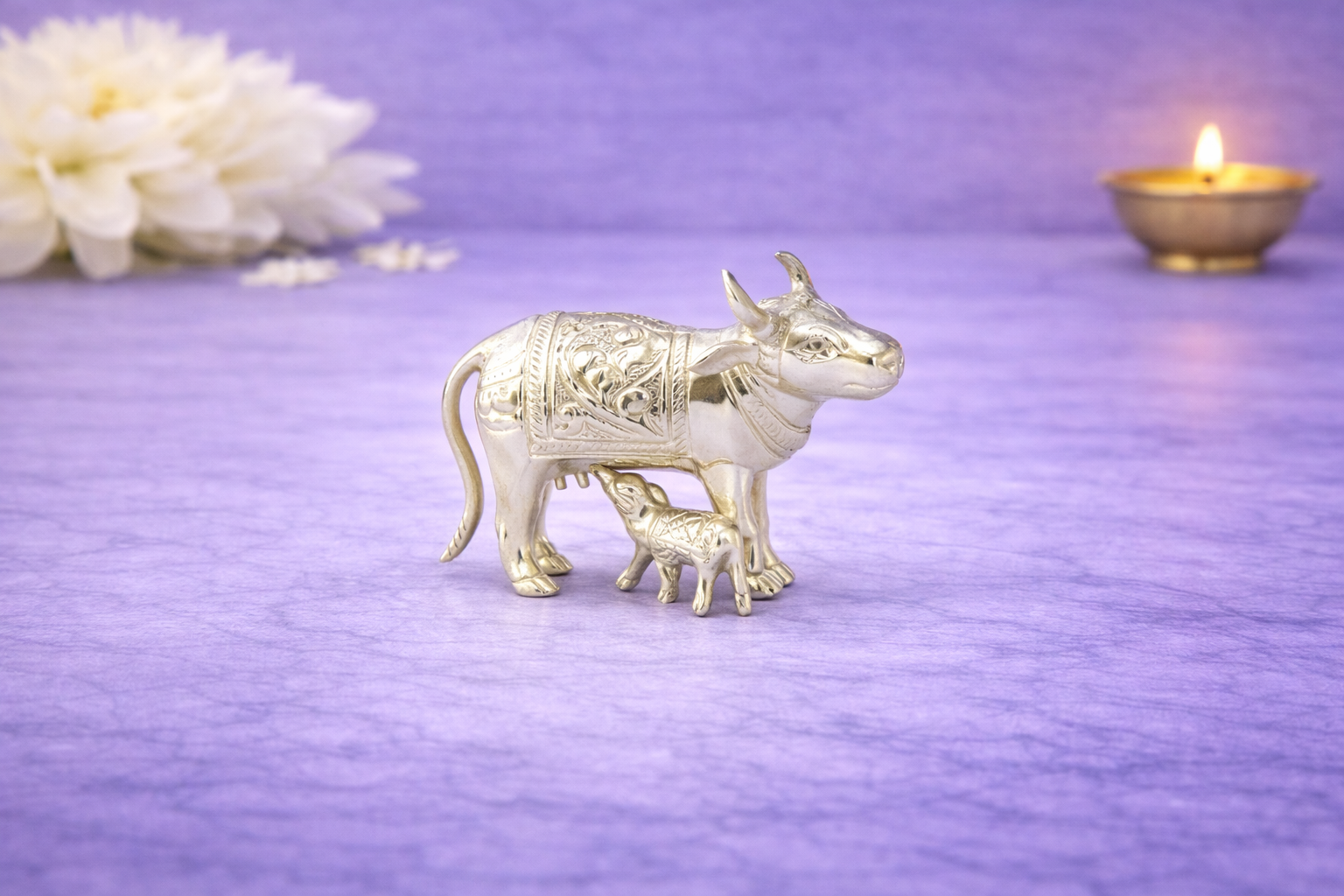 The Cow B Casting Silver Idol is a finely crafted representation of Kamadhenu (Cow with Calf), symbolising abundance, nourishment, motherhood, and divine grace in Hindu tradition. Thoughtfully designed using precision casting techniques, this idol features detailed engravings across the cow’s body, horns, ornaments, and the calf positioned beneath, reflecting traditional craftsmanship with refined detailing.