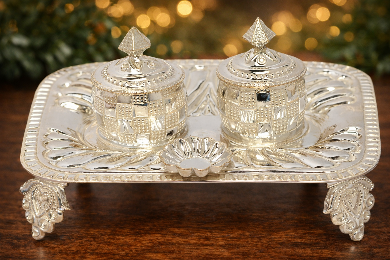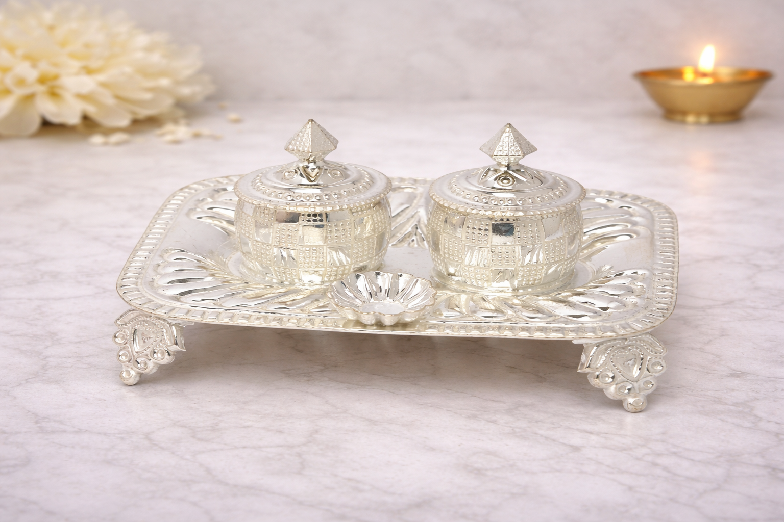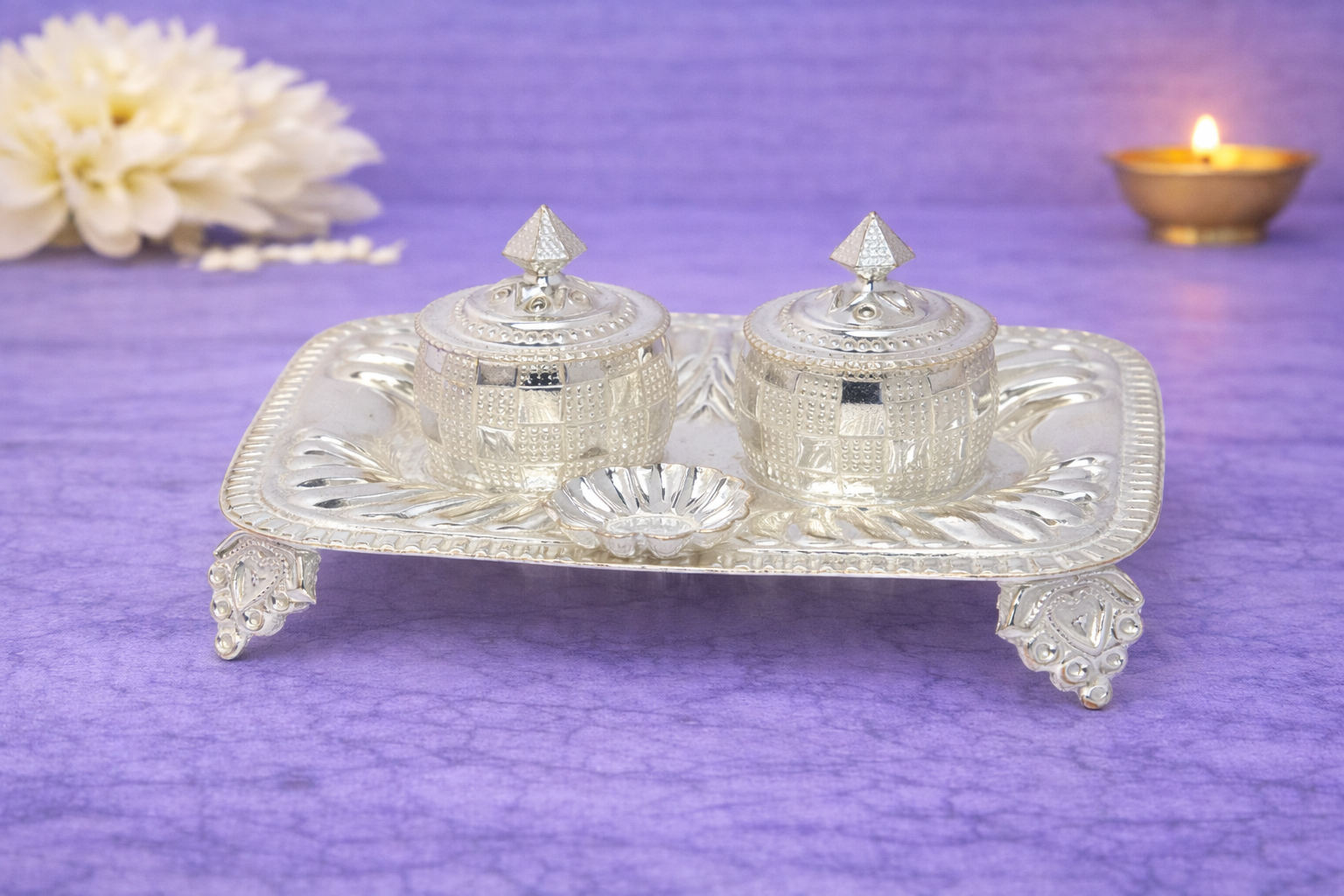 The Dabbi Plate A Silver Puja Set is an exquisitely crafted religious utility designed for traditional worship rituals, featuring a balanced combination of functionality and ornamental detailing. This set comprises two finely detailed dabbi containers placed on an elevated decorative plate, making it ideal for holding kumkum, chandan, or other sacred offerings during daily puja and ceremonial practices.