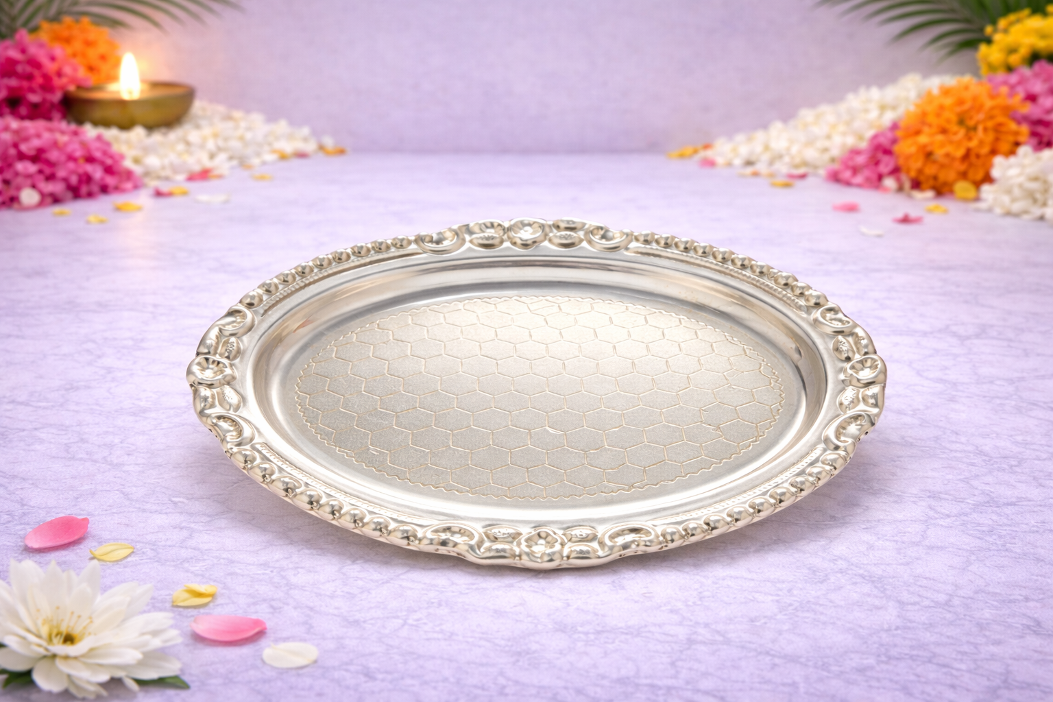 Its spacious surface and gently raised edges make it suitable for serving sweets, dry fruits, prasad, or ceremonial offerings during festivals and special occasions. The detailed border enhances visual appeal while maintaining balance and functionality. Available in multiple weight options, the Delhi Tray caters to diverse needs, from compact home use to grand festive arrangements. A perfect blend of elegance, craftsmanship, and everyday usability, this tray adds distinction to any household or gifting collection.