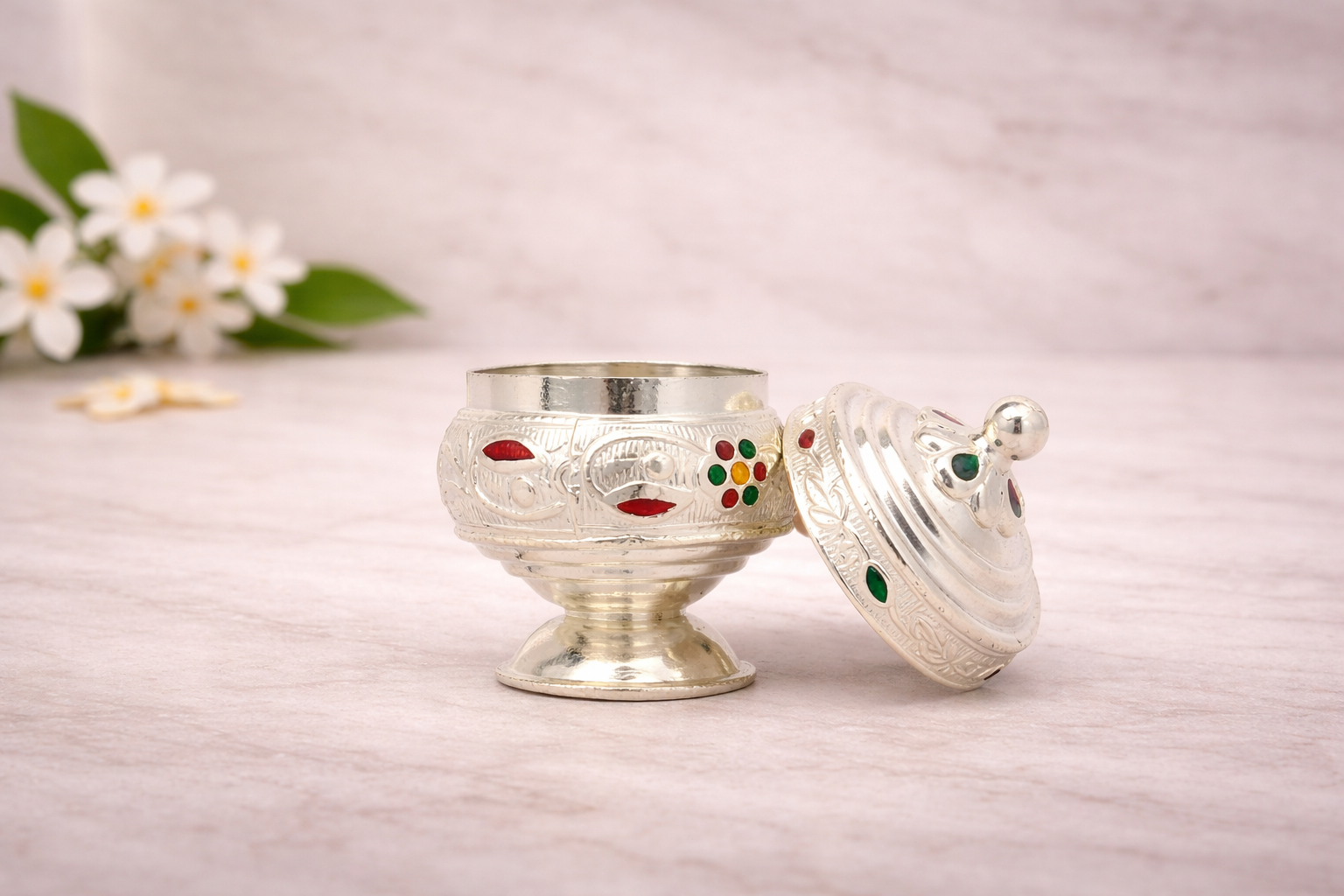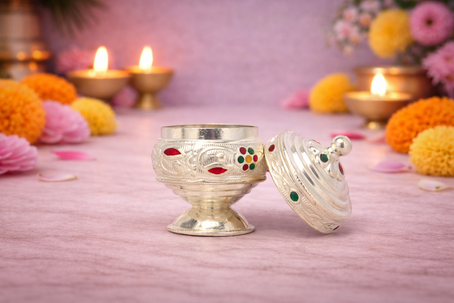 The Fancy Dabi A Silver Kumkum Box is a beautifully crafted religious accessory from the Religious Items Collection, designed to add grace and tradition to everyday puja rituals. Featuring intricate engraved patterns with decorative enamel accents, this dabbi reflects fine craftsmanship while maintaining a compact and elegant form.