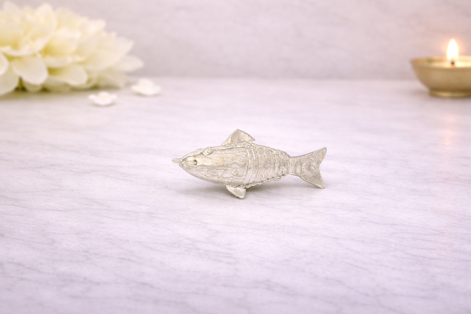 The Fish Silver Idol is a finely crafted symbolic representation associated with prosperity, abundance, and positive energy, often revered in religious and Vastu traditions for attracting wealth and harmony. Meticulously detailed with defined scales, fins, and a balanced form, this idol reflects skilled traditional craftsmanship with a clean, refined finish.