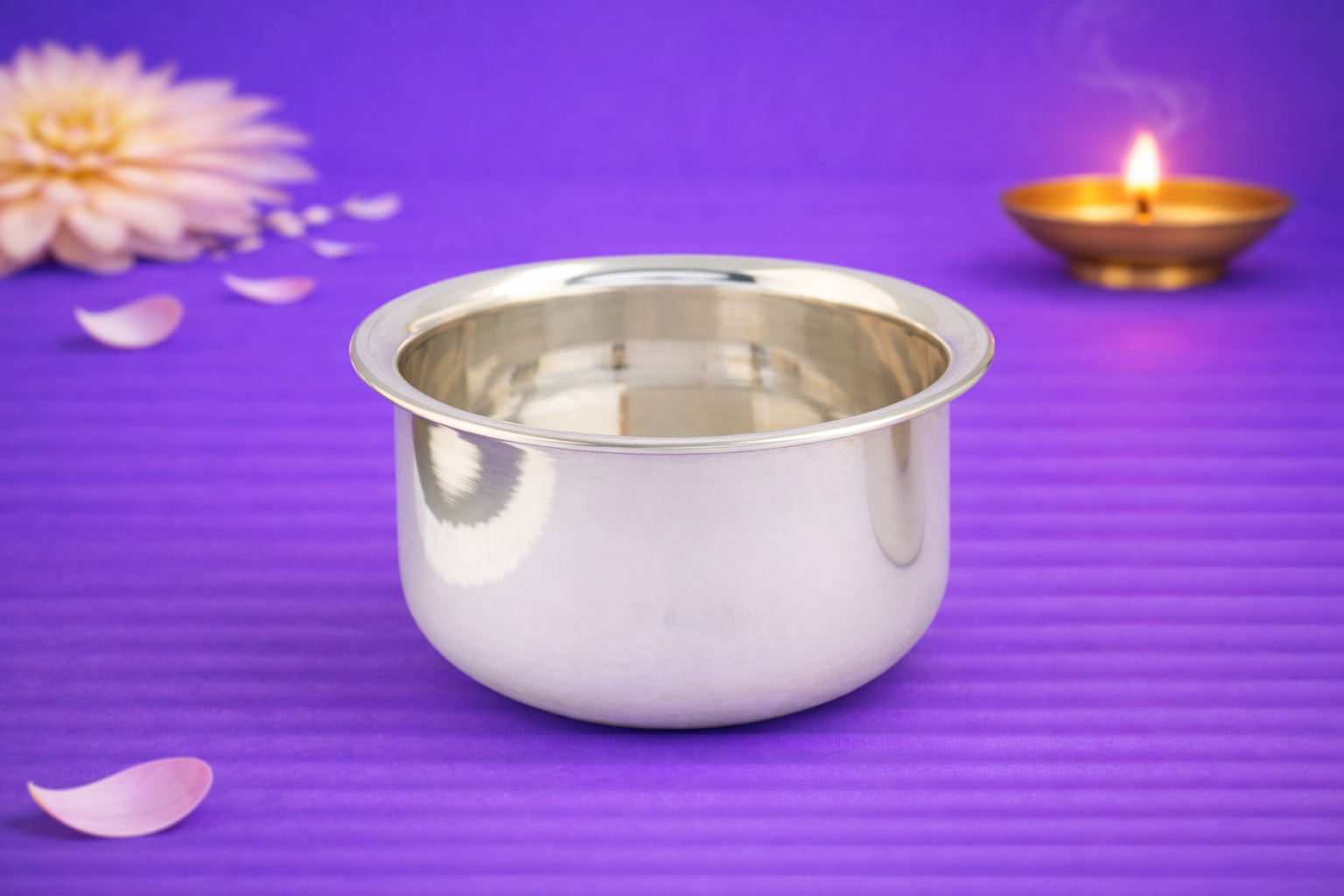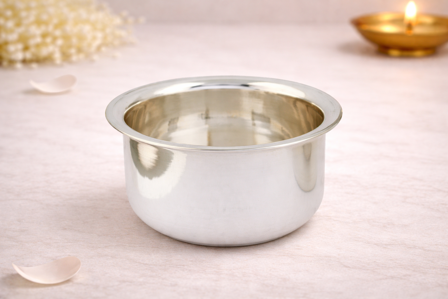 Made from 24KT pure silver, the fulpatra features a smooth, rounded form with a polished finish that maintains the natural brilliance of silver without artificial enhancement. Its sturdy construction ensures durability while remaining lightweight and easy to handle. The clean design makes it suitable for home temples, pooja rooms, festive rituals, and auspicious occasions, as well as for refined household use.