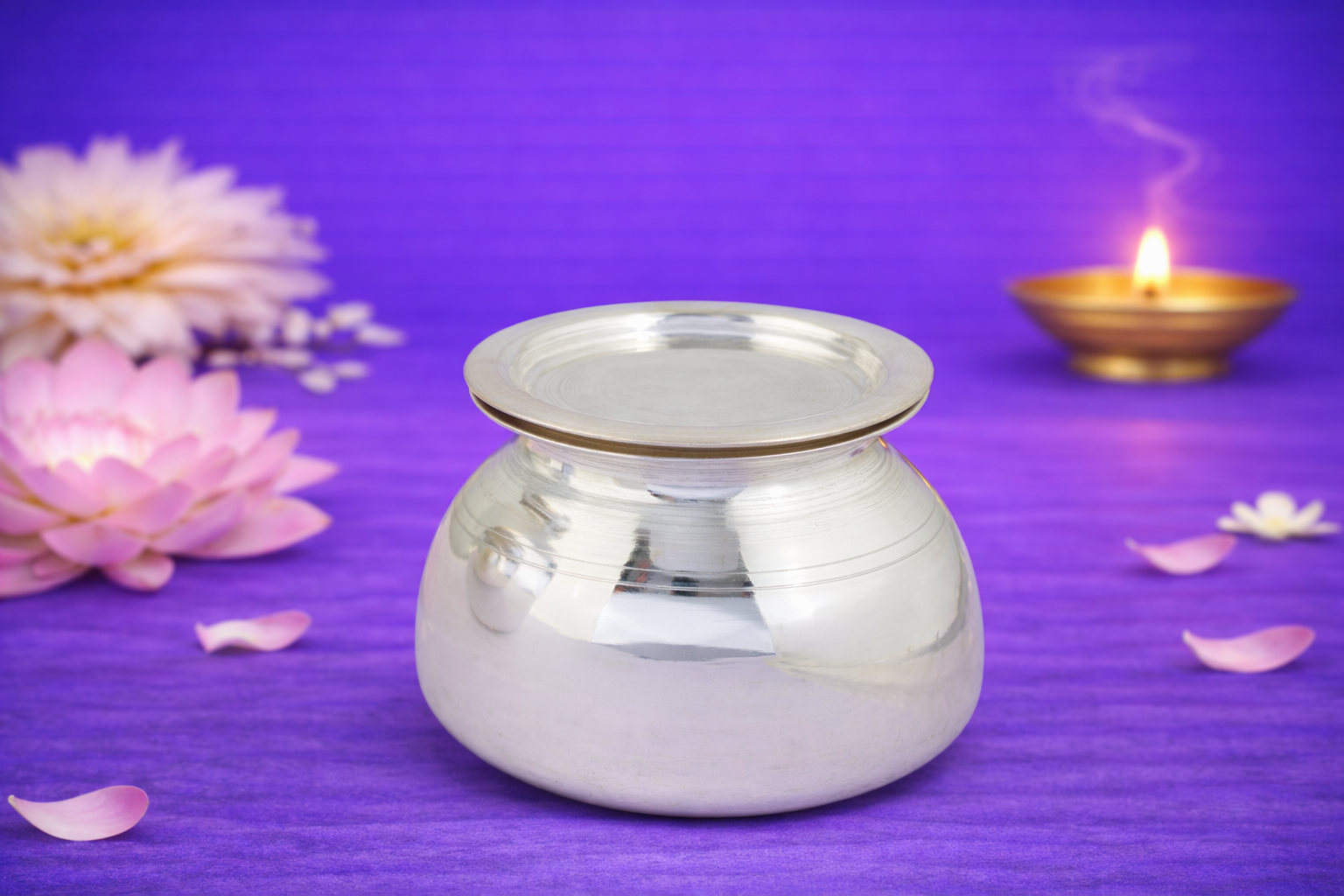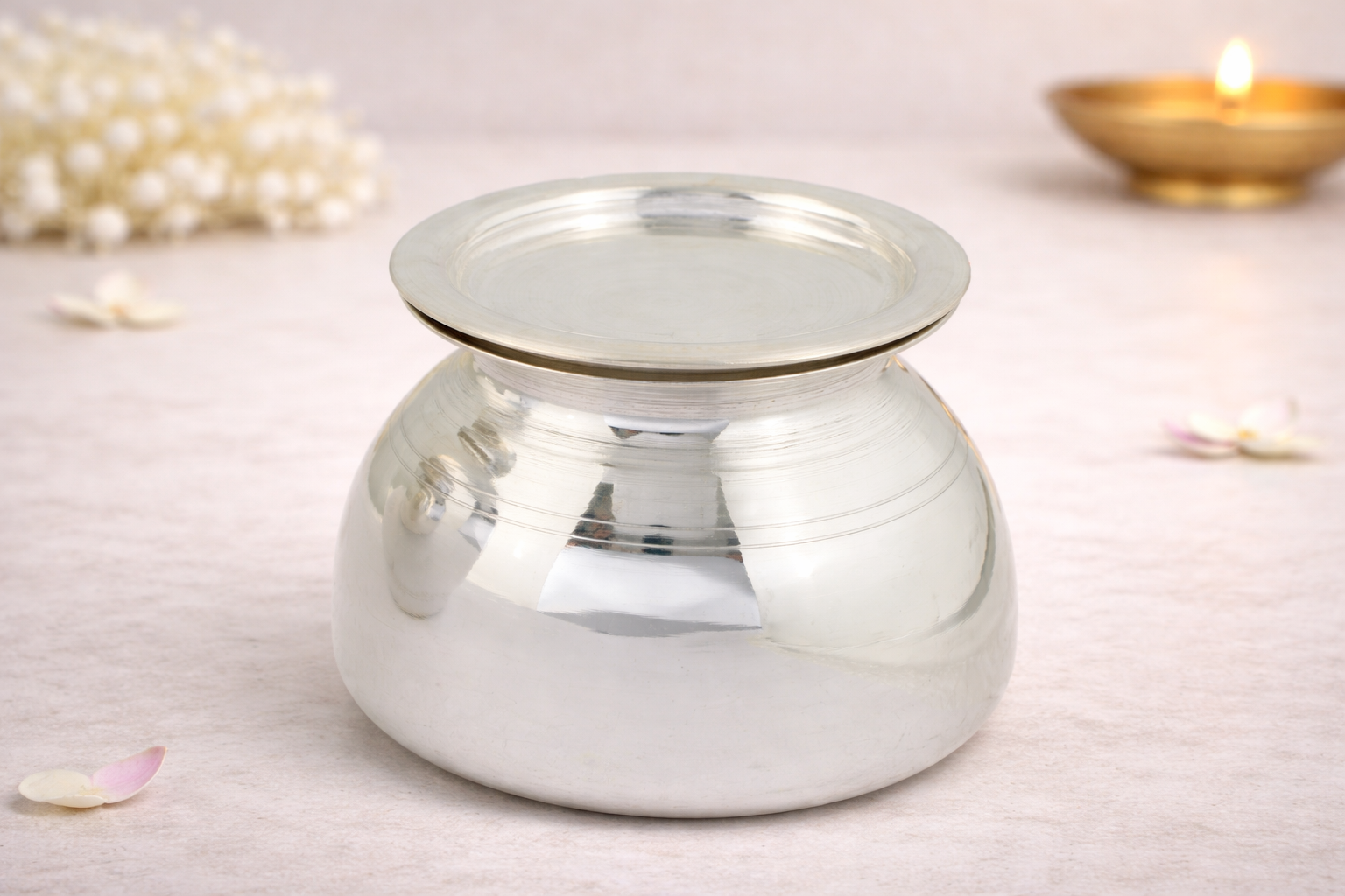 Expertly crafted in 24KT pure silver, the Gilodi features a smooth rounded body with a wide mouth for easy handling and cleaning. Its high-purity silver composition makes it ideal for storing water, milk, charanamrit, or other sacred liquids used in daily puja, religious rituals, and auspicious ceremonies. The natural silver finish is left untouched, preserving its authentic metallic sheen without artificial polishing or enhancement.