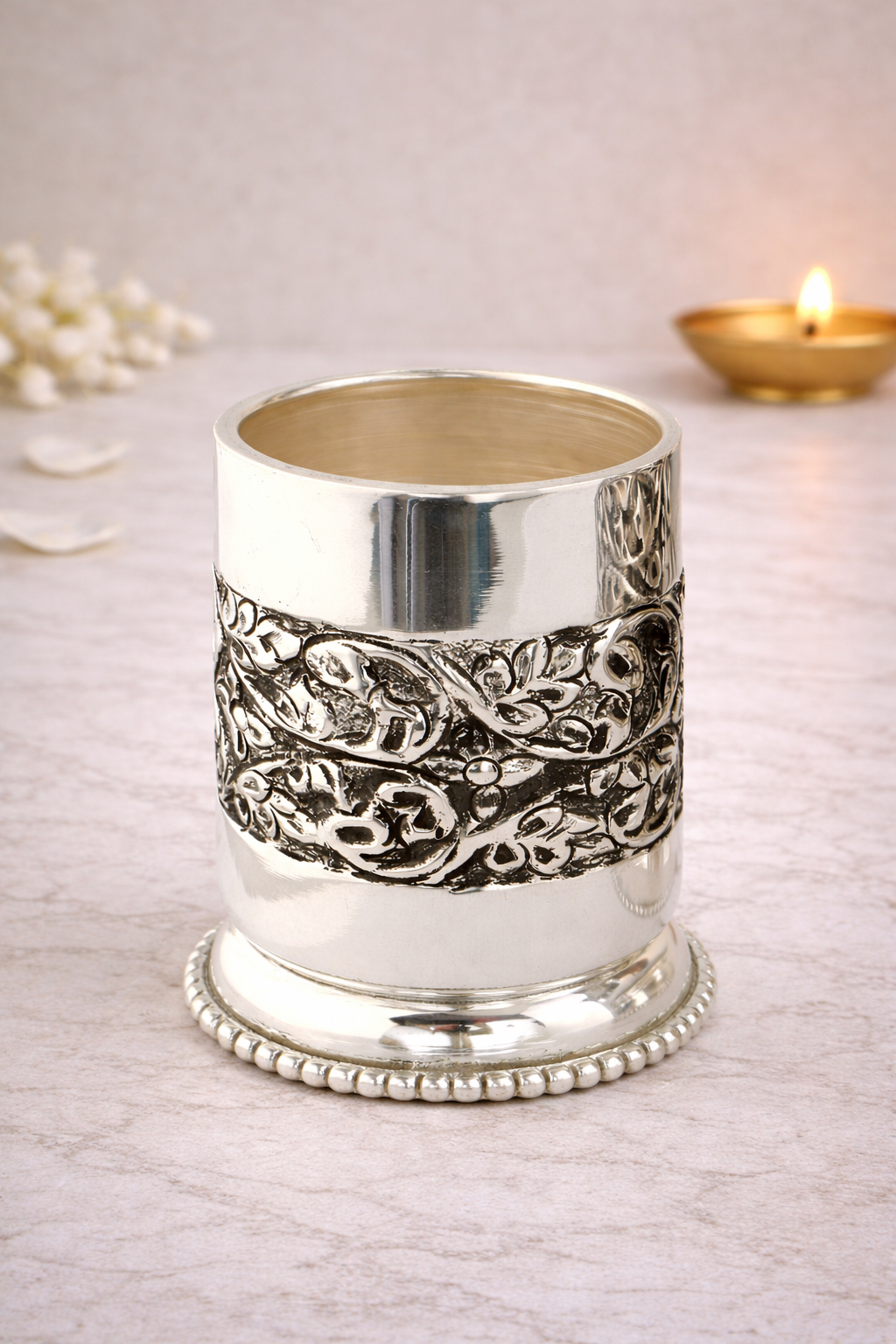 Crafted from 19KT silver, the glass features a solid cylindrical form with traditional embossed detailing that enhances its antique appeal while preserving functionality. The polished surface maintains the natural sheen of silver without artificial enhancement, making it suitable for both ceremonial use and refined dining. Its balanced weight and sturdy construction ensure durability, comfort, and long-lasting use.