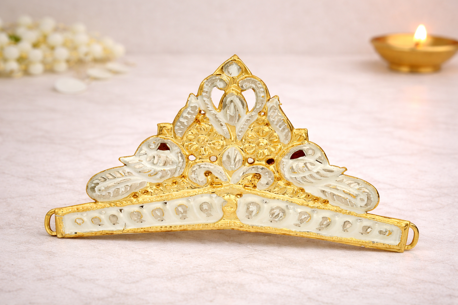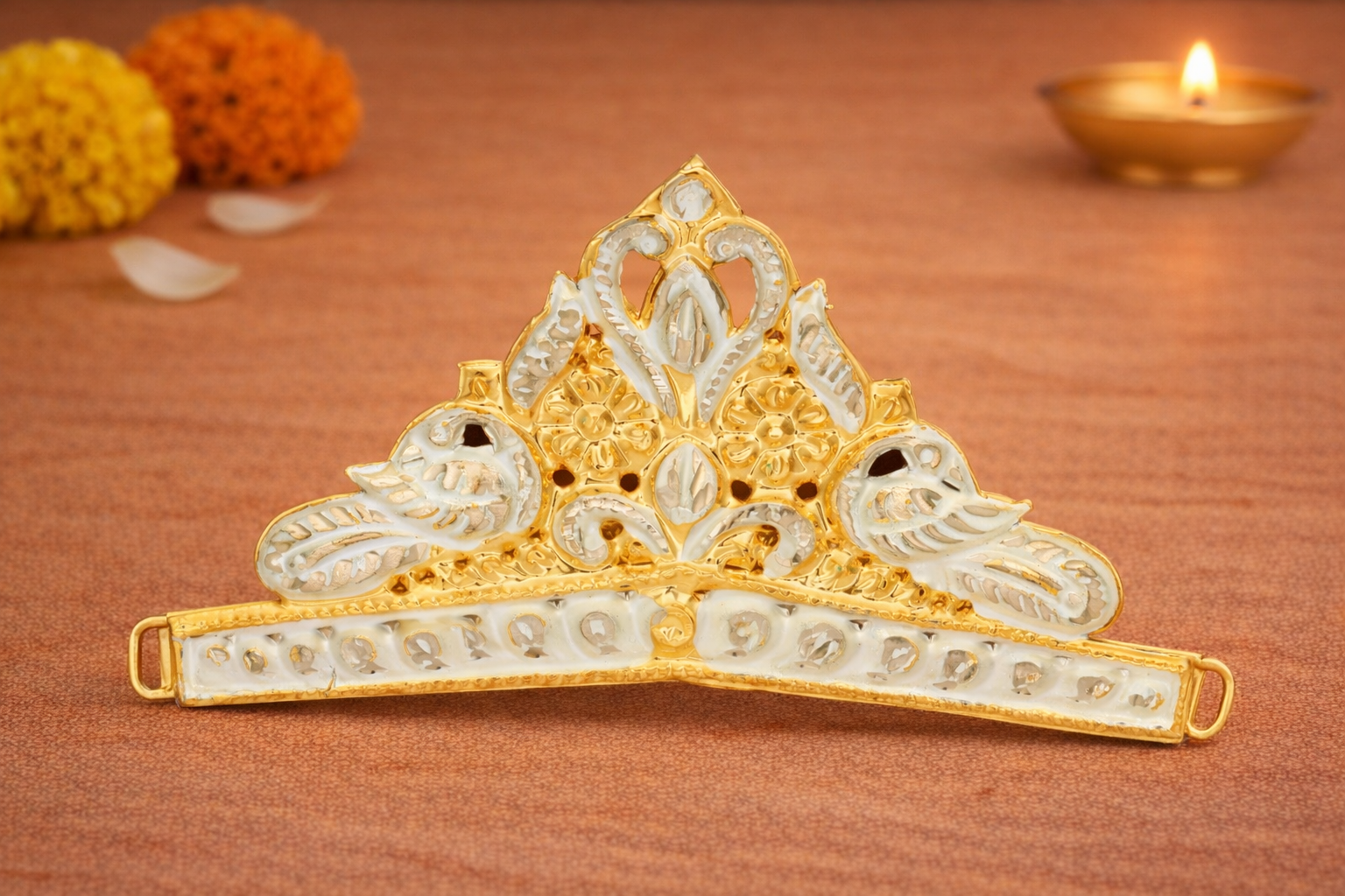 The Golden Mukut is a sacred religious adornment, meticulously crafted for adorning idols of Lord Ganpati and other deities during worship, festivals, and ceremonial occasions. Symbolizing divinity, honor, and spiritual grandeur, this mukut is an essential Ganpati article used in temples, home mandirs, and festive installations.