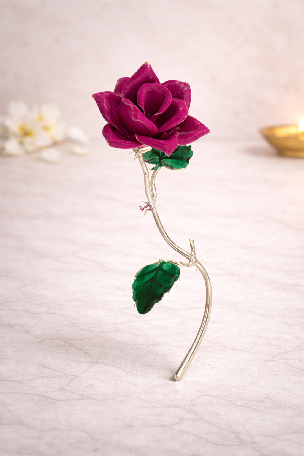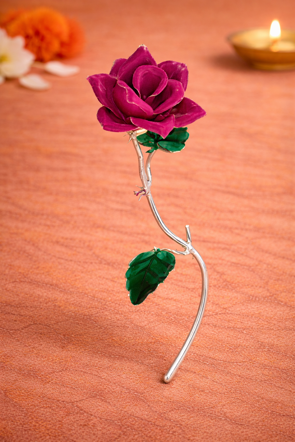 Crafted with fine detailing, the Gulab features delicately shaped rose petals with hand-finished accents, complemented by a slender silver stem and leaves. Made from 16KT silver, it retains a refined sheen while preserving the authentic handcrafted character of traditional religious articles. The balanced proportions and intricate workmanship make it suitable for placement near Ganpati idols, pooja thalis, or sacred altars.