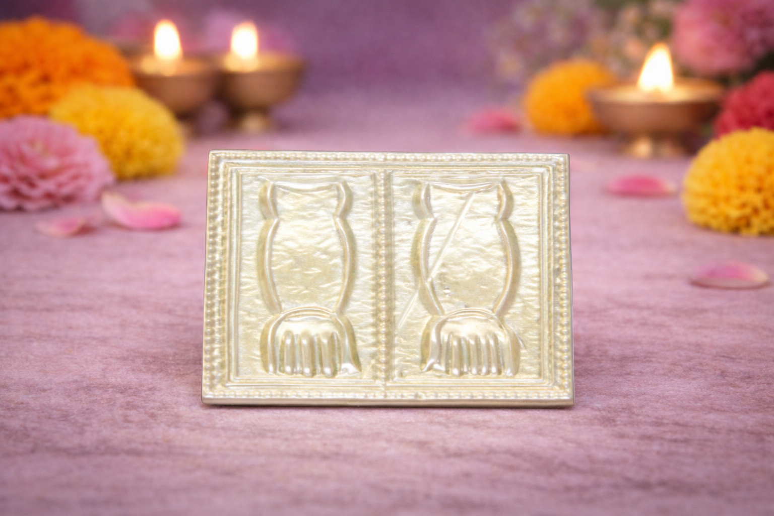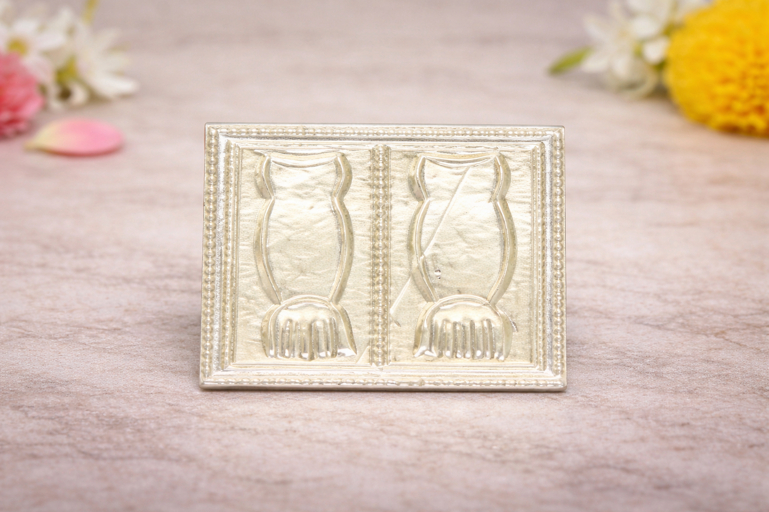 The Haath Silver Yantra is a sacred and finely crafted religious article from the Religious Items Collection, symbolizing divine blessings, protection, and auspiciousness. Designed in the traditional charan paduka (holy feet) form, this yantra holds deep spiritual significance and is widely revered in puja rituals and temple worship.