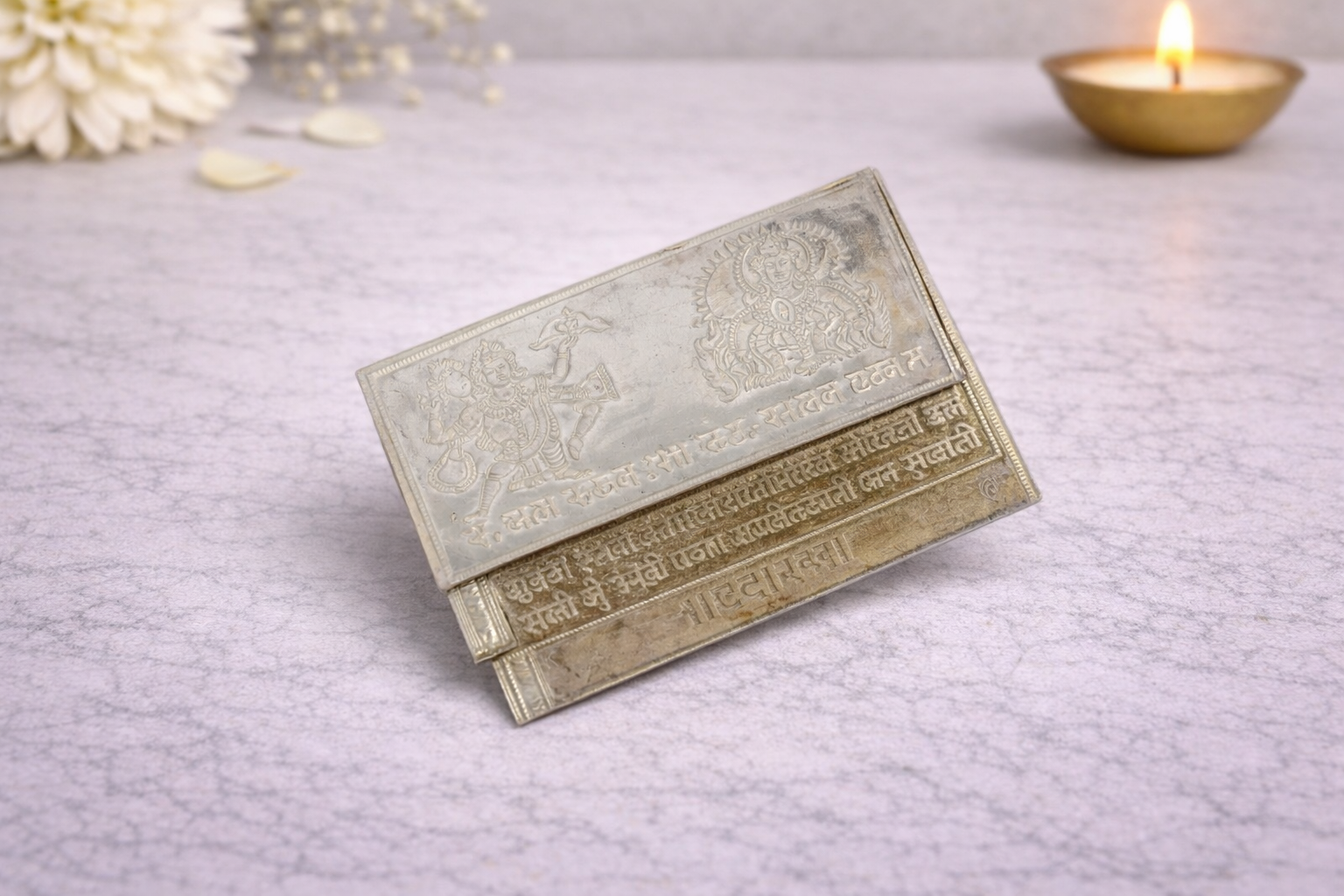 Expertly manufactured in 16KT silver purity, the Hanuman Chalisa features a natural silver finish that enhances its engraved artwork and textual detailing while ensuring durability for long-term devotional use. Its balanced proportions and refined structure make it ideal for regular worship, travel mandirs, and ceremonial offerings.