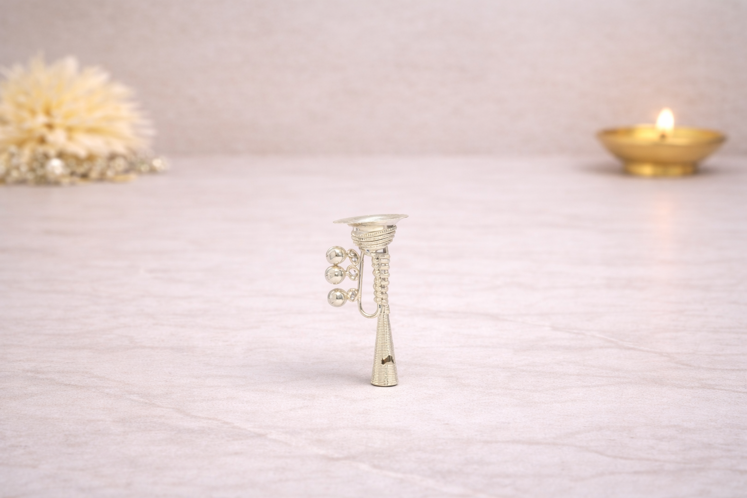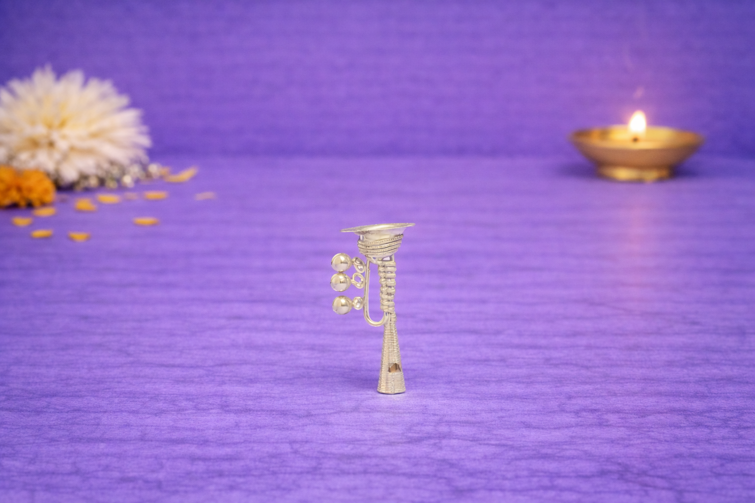 Crafted in 19KT silver, this jhunjhuna features a smooth conical handle with finely finished detailing and multiple polished silver bells that create a gentle, soothing sound. The balanced design ensures ease of grip for small hands while maintaining durability and comfort. Its naturally polished silver finish retains authentic metallic shine without artificial enhancement, making it both visually appealing and safe for ceremonial use.