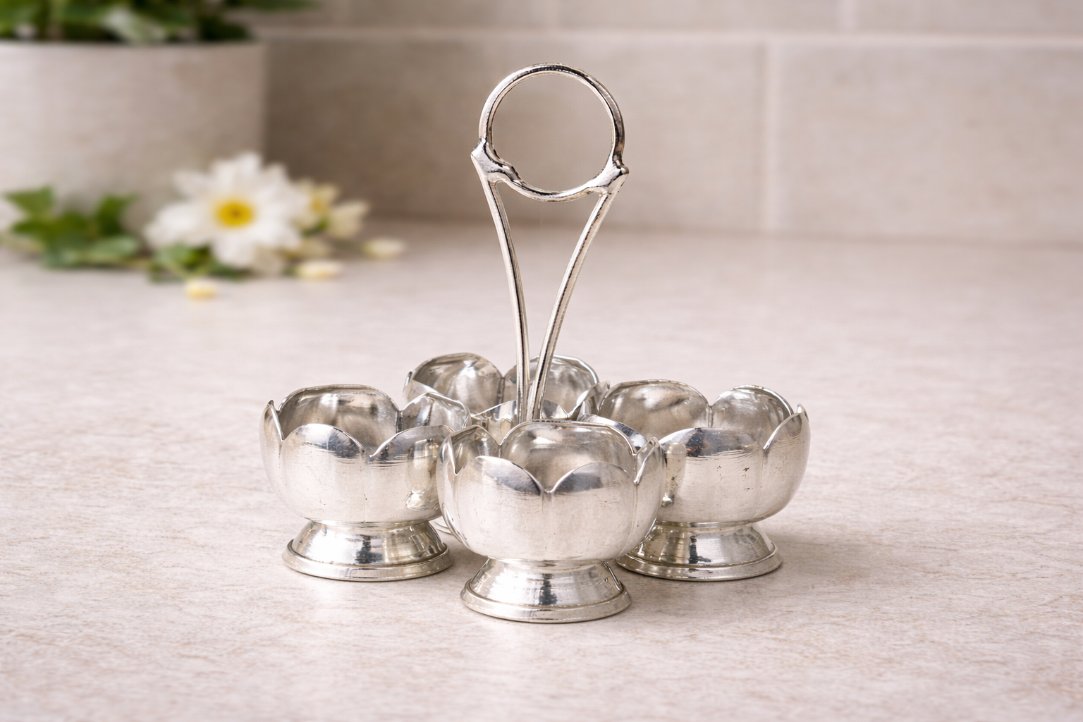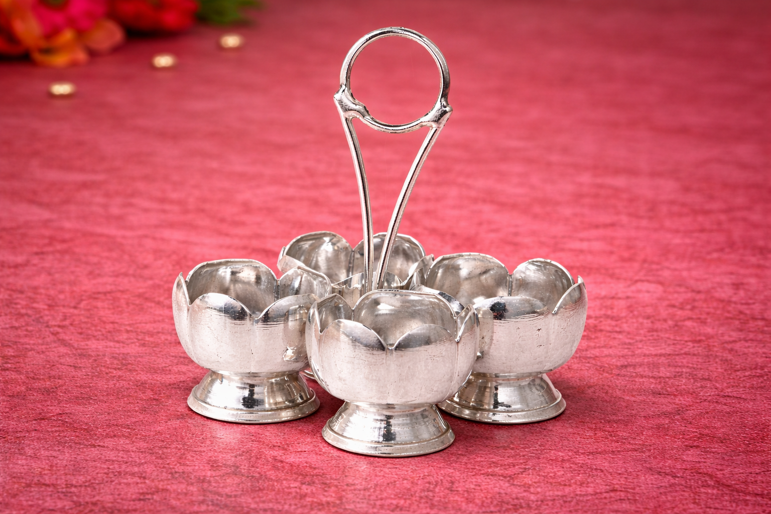 The Jodkamal 1F Silver Religious Jodkamal is a traditionally crafted devotional article designed with refined detailing and balanced structure. Featuring a symmetrical multi-bowl form connected by a sturdy central handle, this piece reflects classic temple-inspired aesthetics while maintaining a clean and elegant appearance suitable for daily rituals and festive occasions.