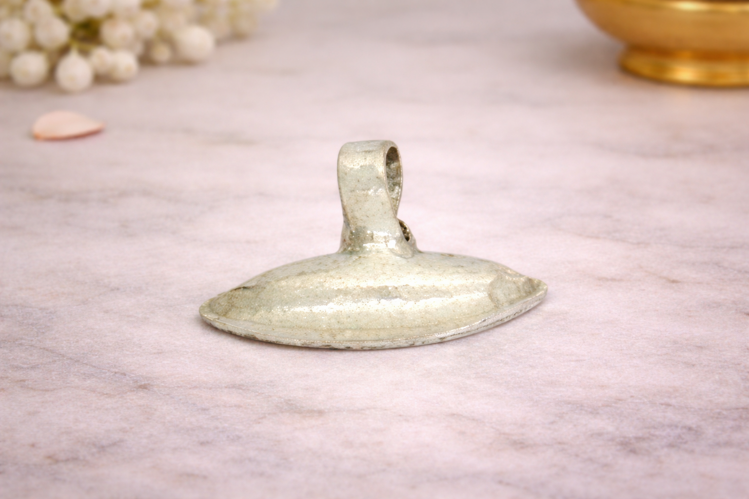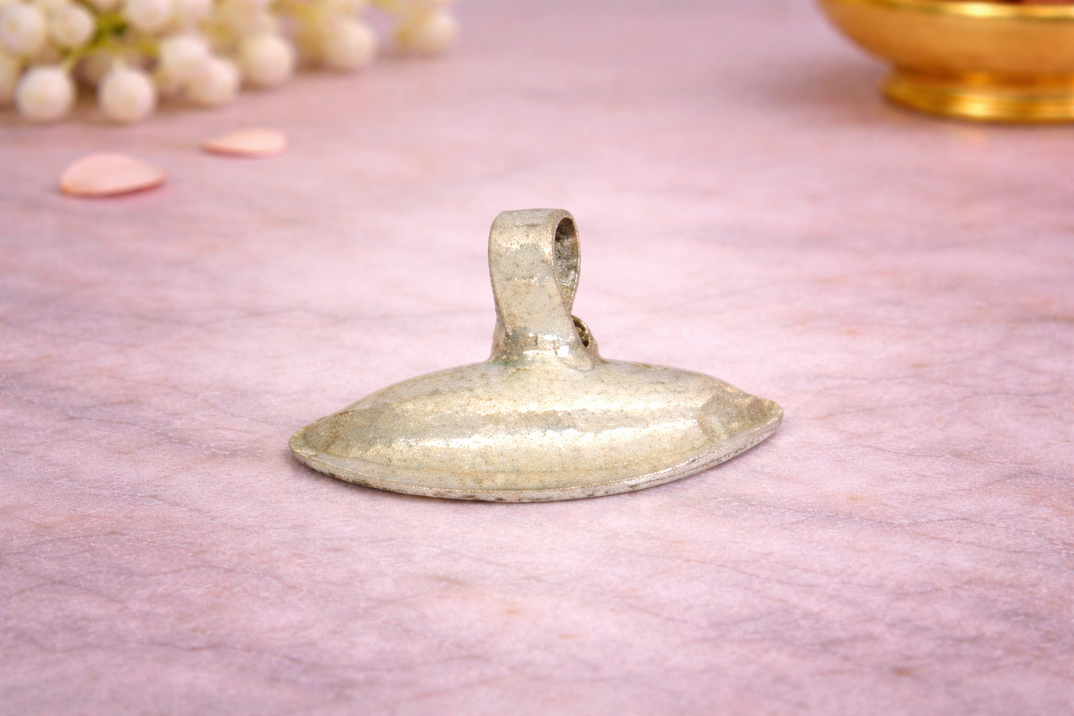 Crafted in 24KT silver purity, the piece features a natural silver finish that preserves the metal’s authenticity and spiritual sanctity. Its sturdy and balanced structure makes it suitable for placement in puja thalis, ritual offerings, sacred spaces, or as part of ceremonial arrangements, while maintaining durability for regular religious use.