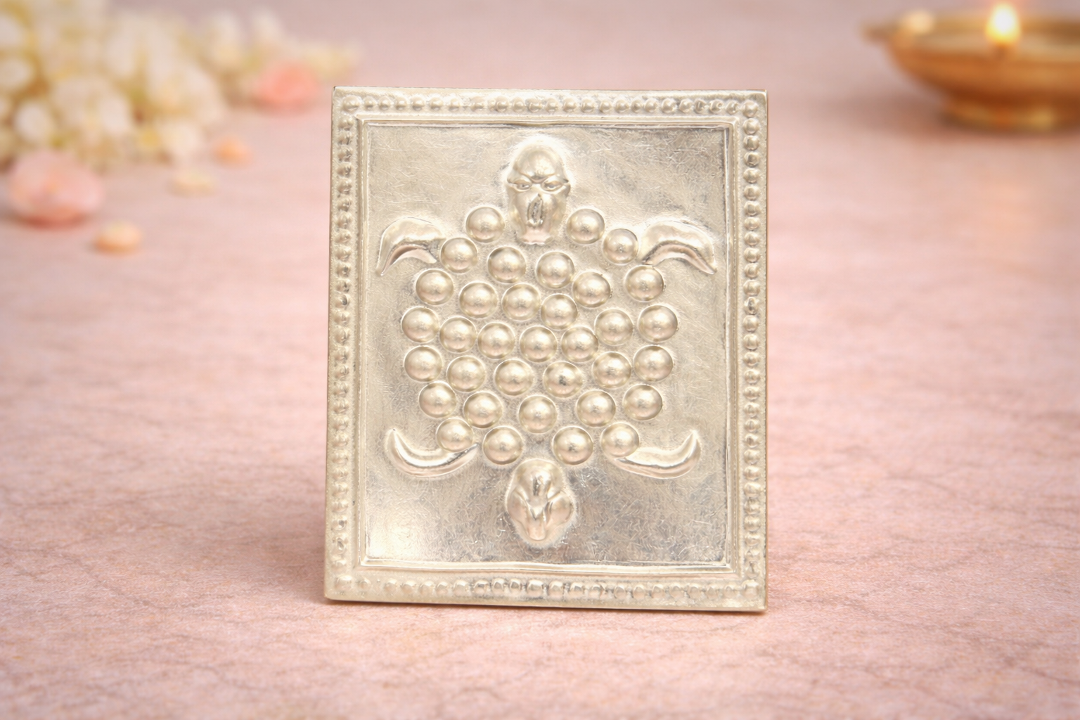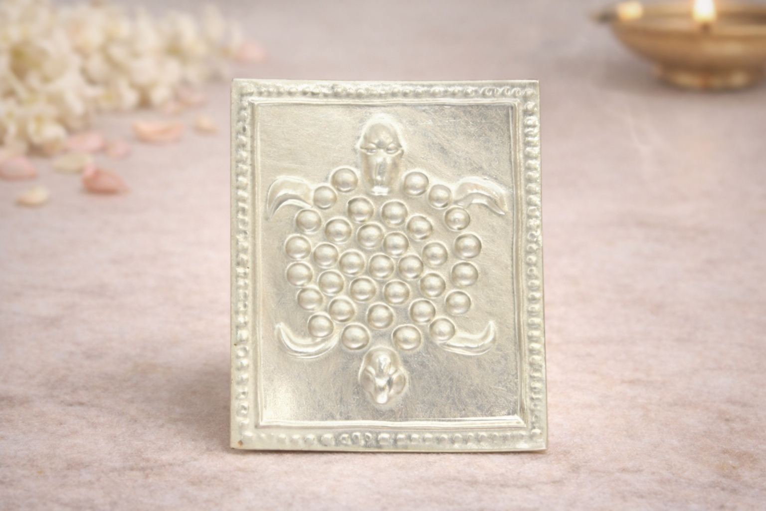 The Kachuva Silver Yantra is a spiritually meaningful religious article symbolising stability, longevity, protection, and prosperity in traditional Hindu belief systems. The turtle (Kachuva) is revered as a sacred symbol of grounding energy and steady progress, making this yantra an auspicious element in ritual worship and vastu practices.
