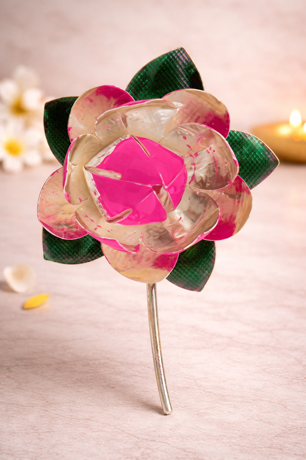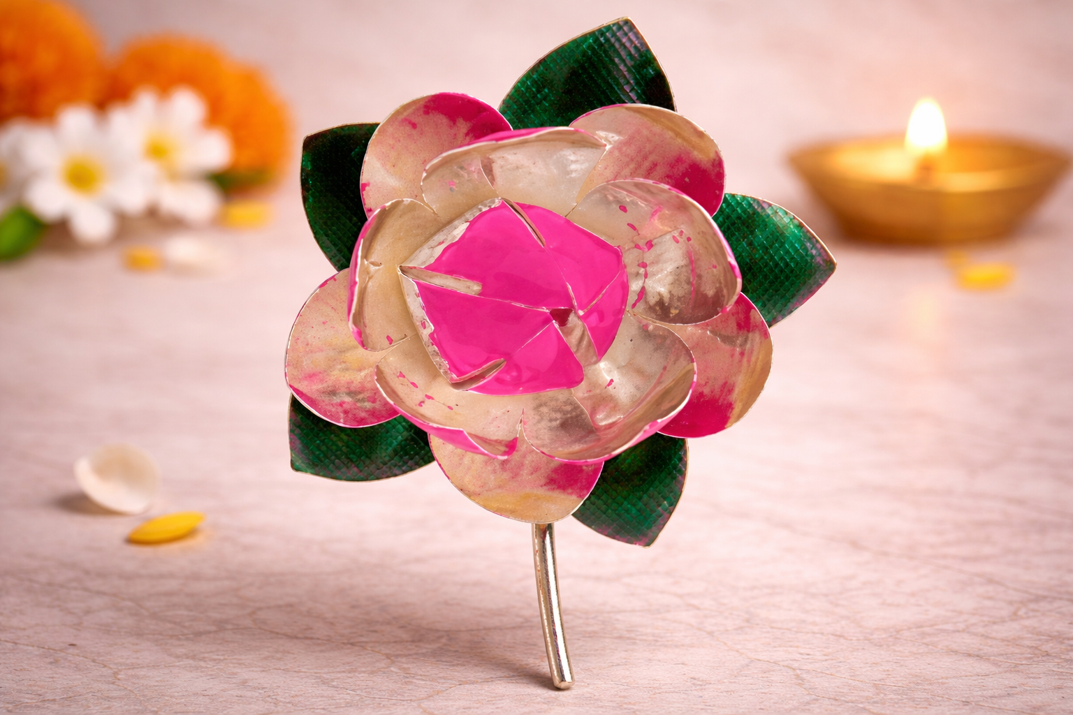 Crafted from 16KT silver, the Kamal A features finely shaped petals with subtle color detailing that enhances its traditional appeal while preserving the natural metallic character of the piece. The balanced form and intricate craftsmanship reflect classic Indian religious artistry, making it suitable for both ceremonial use and decorative placement near idols and sacred spaces.