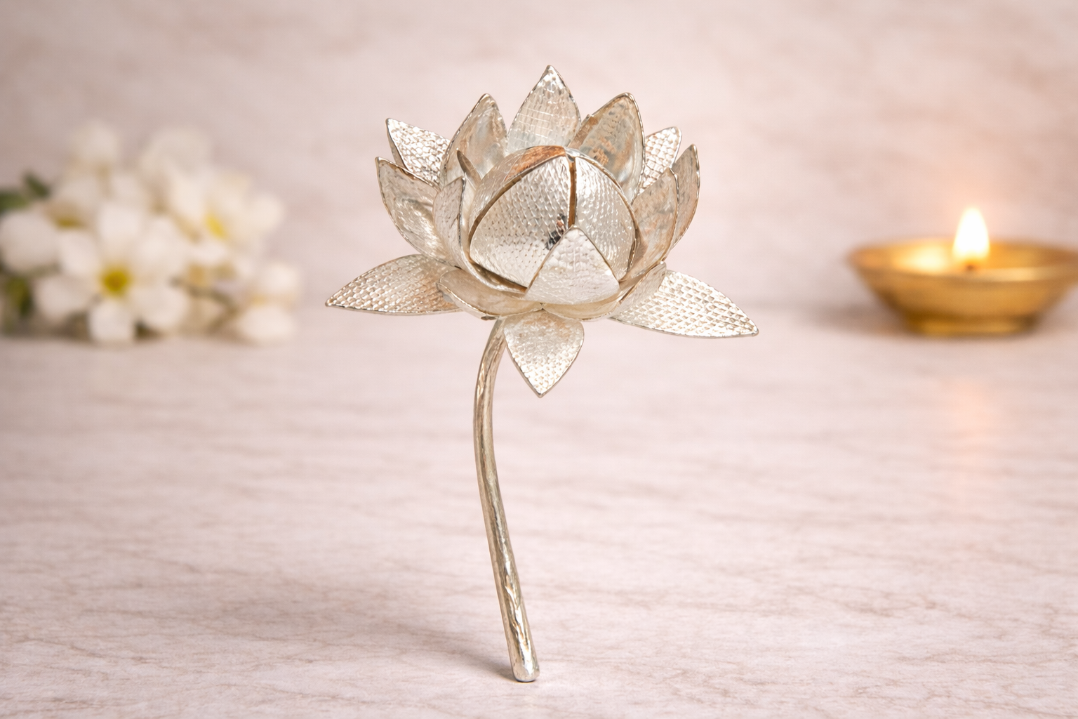 Expertly handcrafted in 16KT silver, this Kamal B features a delicately layered lotus design with fine detailing that reflects traditional Indian metal craftsmanship. The balanced proportions and refined finish preserve the natural sheen of silver while maintaining a lightweight yet durable structure. Its elegant form makes it ideal for placement near idols, in pooja thalis, or as a sacred offering during auspicious occasions.