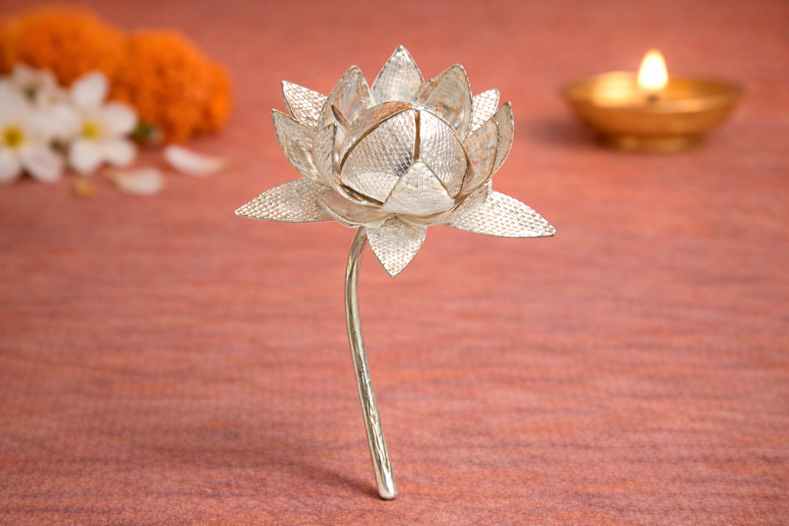 The Kamal B Pure Silver Lotus is a symbolic religious accessory crafted for devotional use, representing purity, prosperity, and divine grace. Traditionally associated with Lord Ganpati and other Hindu deities, the lotus (Kamal) is widely used in pooja rituals, festive decorations, and temple adornments.
