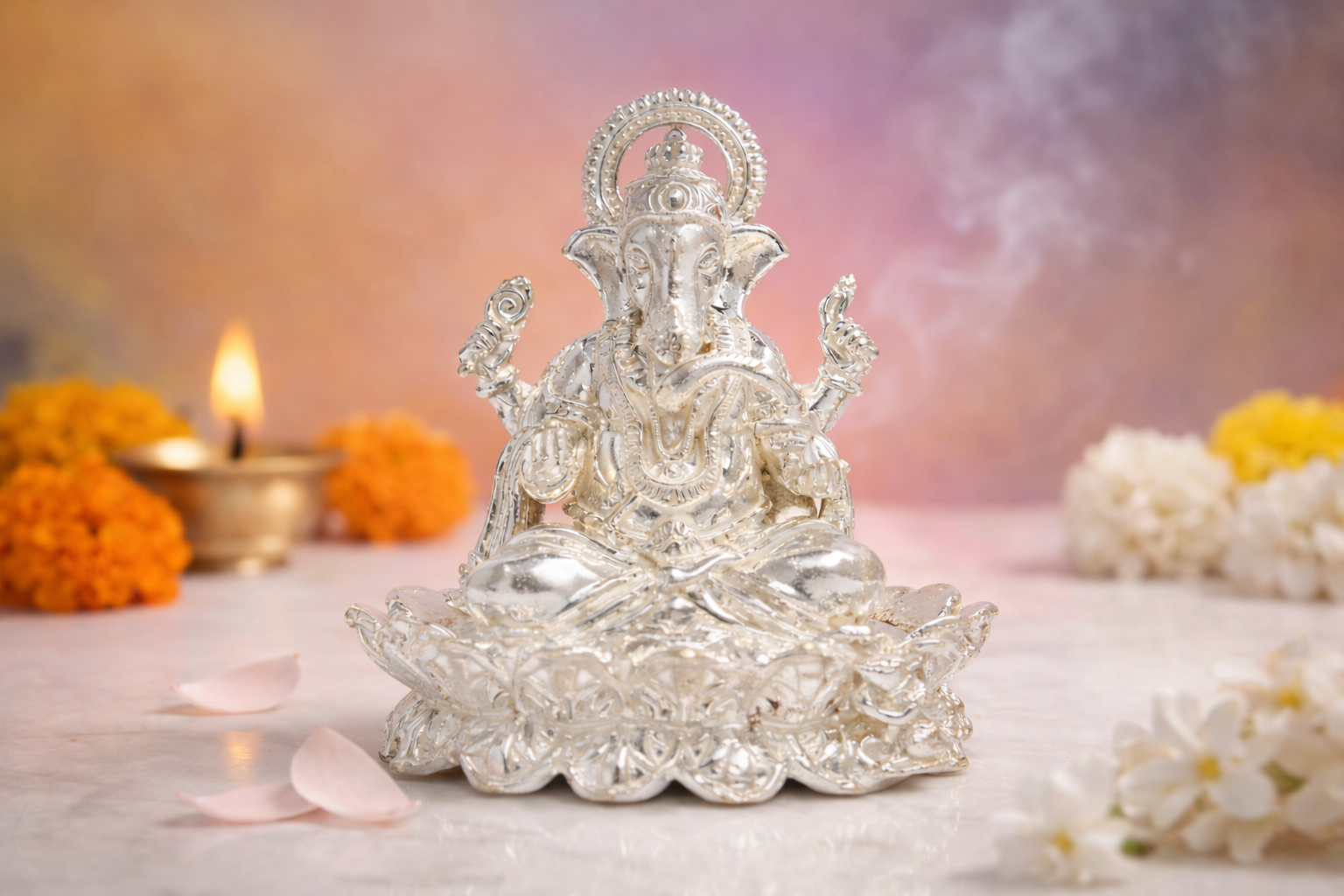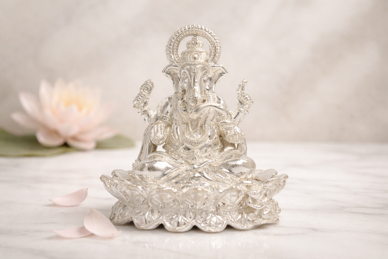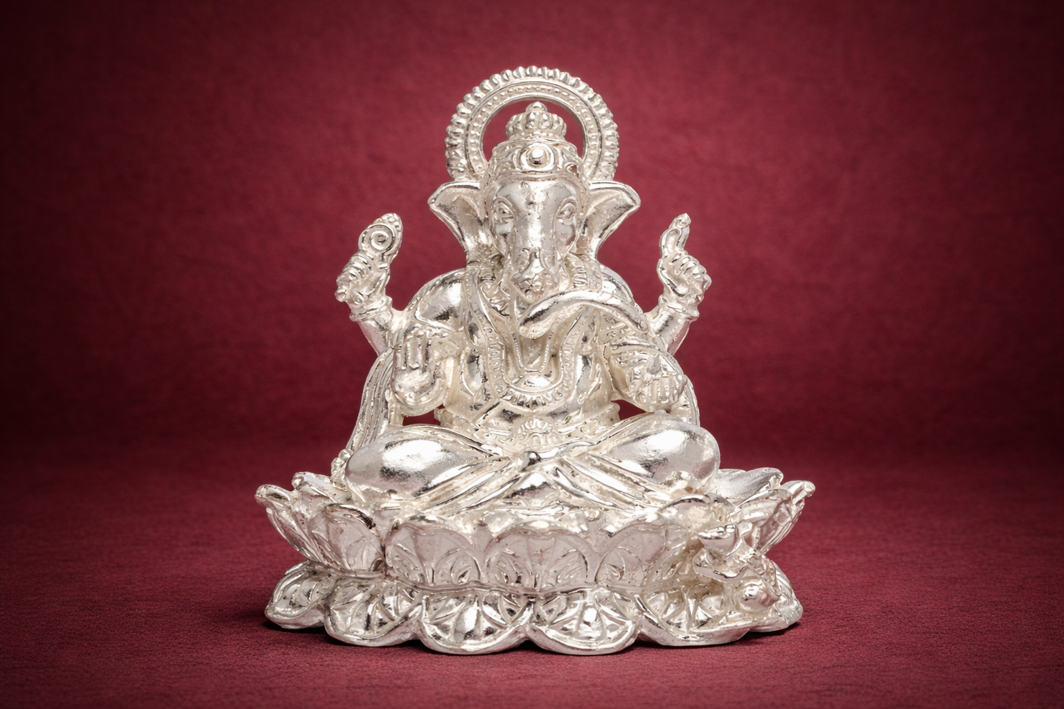 The Kamal Ganpati Casting Silver Idol is a finely crafted representation of Lord Ganesha seated gracefully on a lotus pedestal, symbolising wisdom, prosperity, and auspicious beginnings. Crafted with precision using advanced casting techniques, this idol highlights intricate detailing across the crown, facial features, ornaments, and lotus base, reflecting traditional craftsmanship with refined elegance.