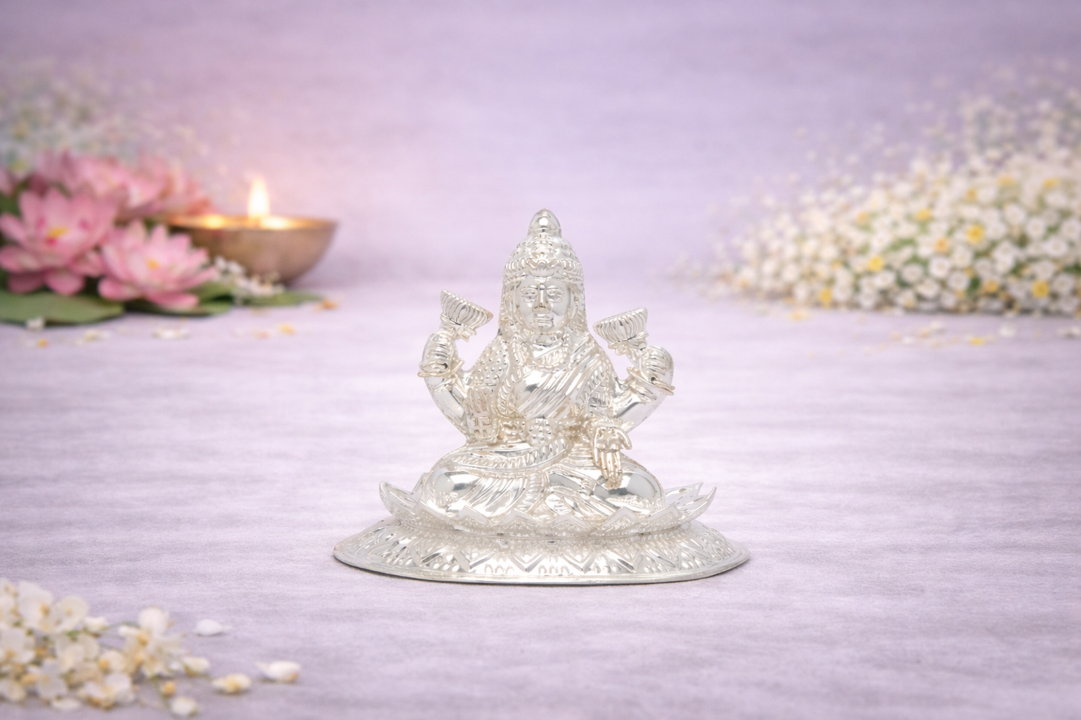 Perfect for devotees seeking an authentic silver Lakshmi idol, this piece is available in multiple weight options to suit varied preferences and requirements.