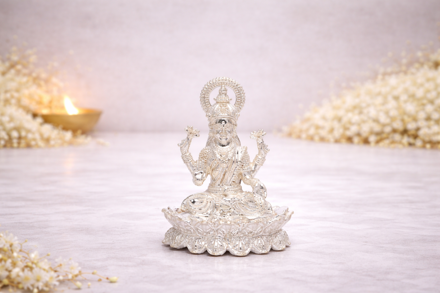 Crafted in 14KT solid silver, the Kamal Laxmi idol features intricate detailing, a balanced posture, and a polished finish that enhances its divine presence. Available in a wide range of weight variants, it suits both personal worship needs and premium gifting requirements. This silver Lakshmi idol is a perfect blend of devotion, artistry, and investment-grade purity.