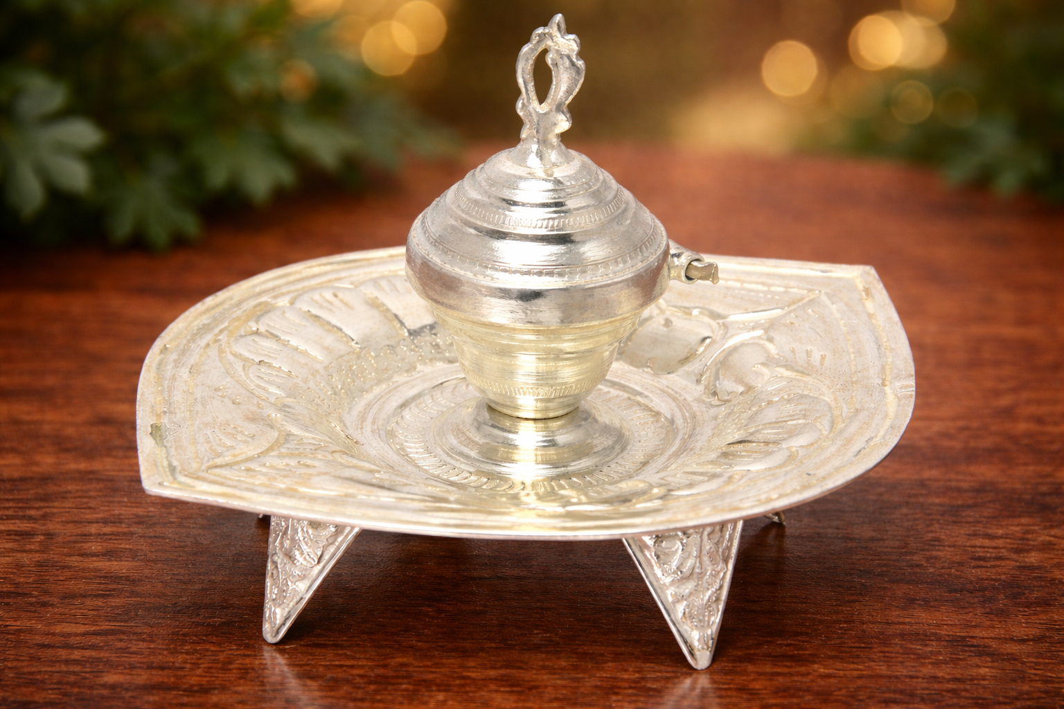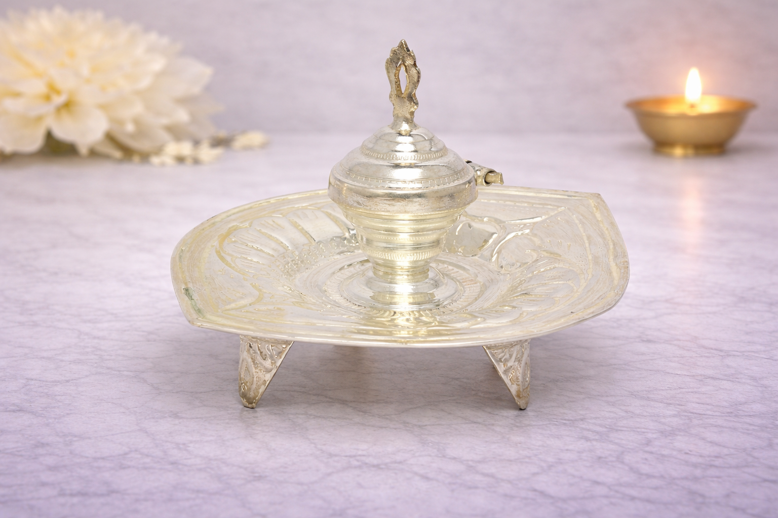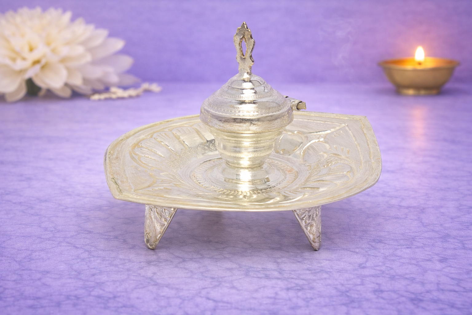 The Kankavati B Silver Dabi is a finely crafted traditional puja accessory designed for the ritual storage of kumkum, chandan, haldi, or akshat. Rooted in classical Indian worship practices, this piece reflects elegance, purity, and devotion, making it an essential element for daily puja rituals and ceremonial offerings.
