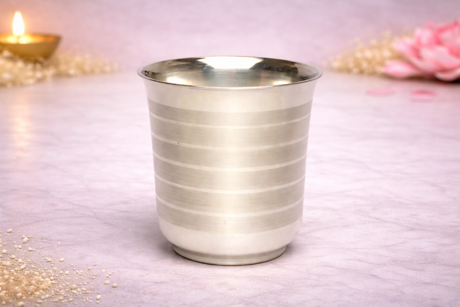 The Kashmira Saat Patta Glass is a refined household essential crafted for everyday use as well as traditional dining and ritual purposes. Designed with a classic straight profile and subtle horizontal detailing, this glass reflects understated elegance combined with functional durability. Made from 14KT silver, it represents purity, hygiene, and timeless Indian craftsmanship, making it suitable for daily water consumption, religious use, and premium gifting.