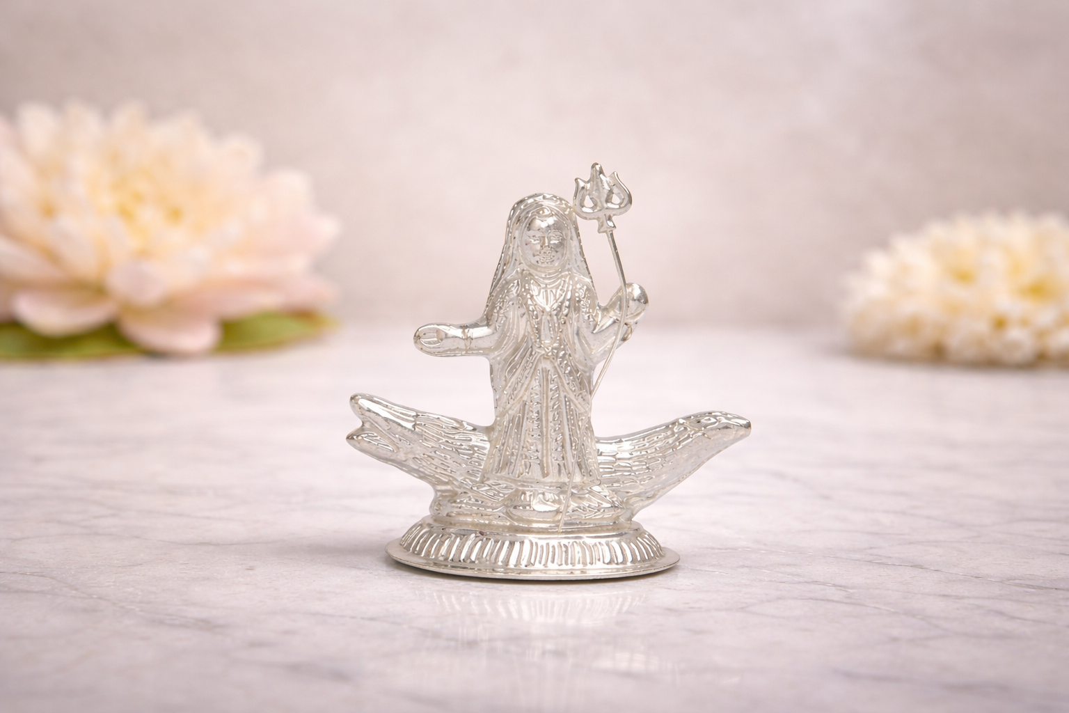 Crafted in 18KT silver purity, the idol carries a natural silver finish that preserves its authentic metallic brilliance without artificial enhancement. The hollow construction ensures a lighter form while retaining visual richness and structural balance, making it suitable for placement in home mandirs, offices, temples, or as an auspicious gift for religious ceremonies, festivals, and spiritual occasions.