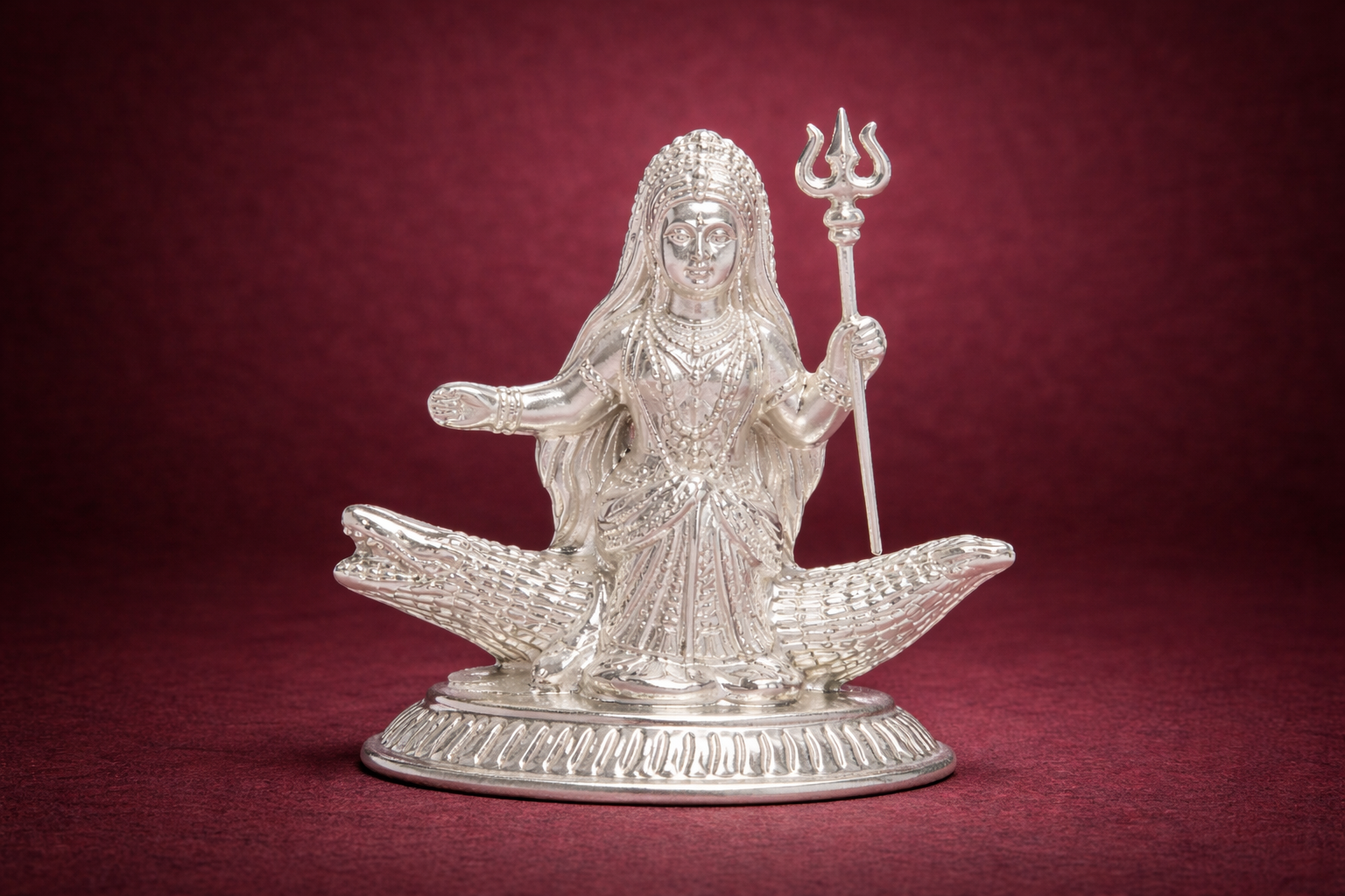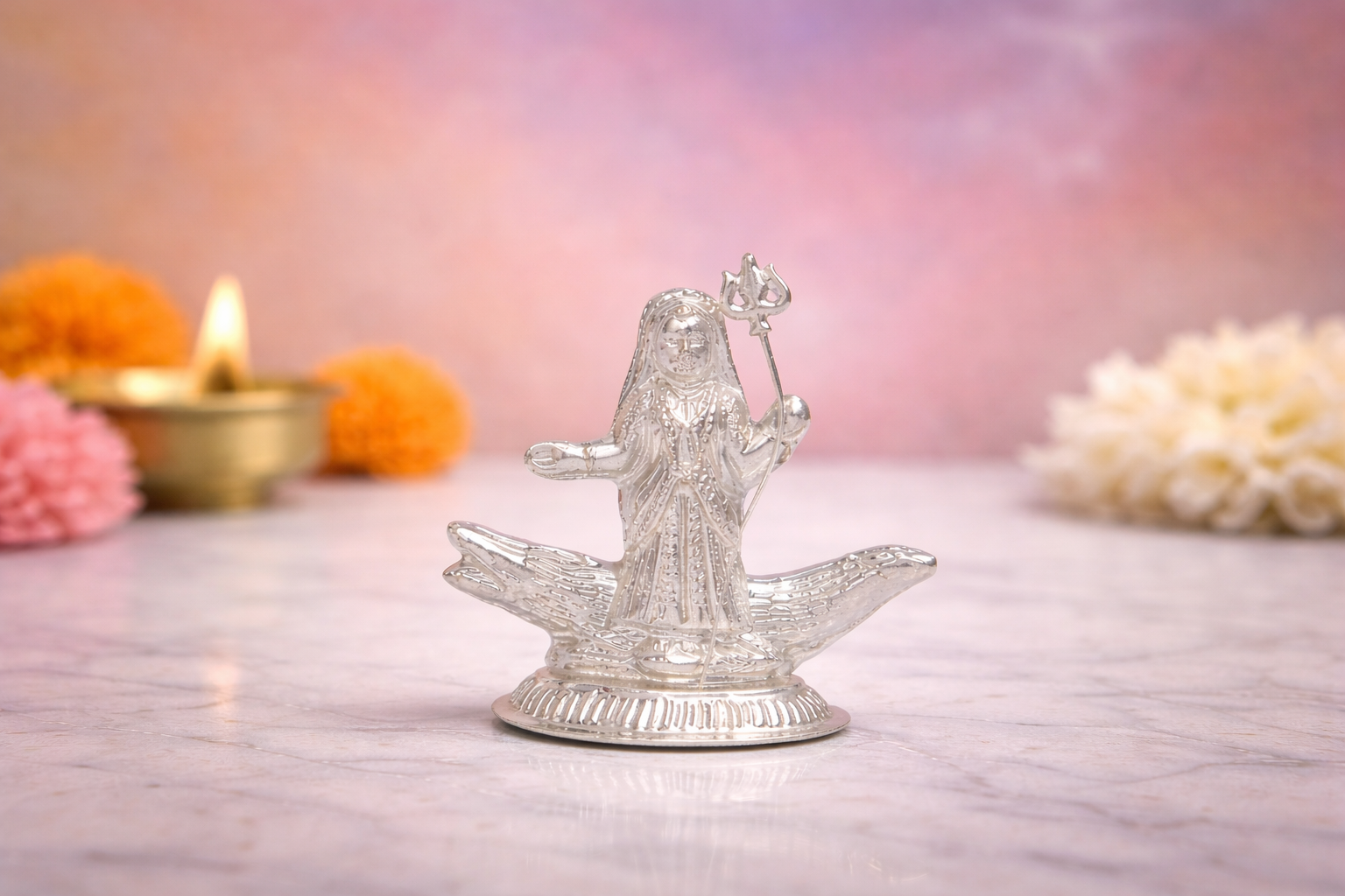 The Khodiyar Silver Idol is a finely crafted representation of Goddess Khodiyar, revered as a symbol of protection, strength, and divine guidance. Designed with careful attention to traditional iconography, the idol features intricate detailing across the facial expression, attire, ornaments, and symbolic elements, reflecting skilled craftsmanship and refined finish.