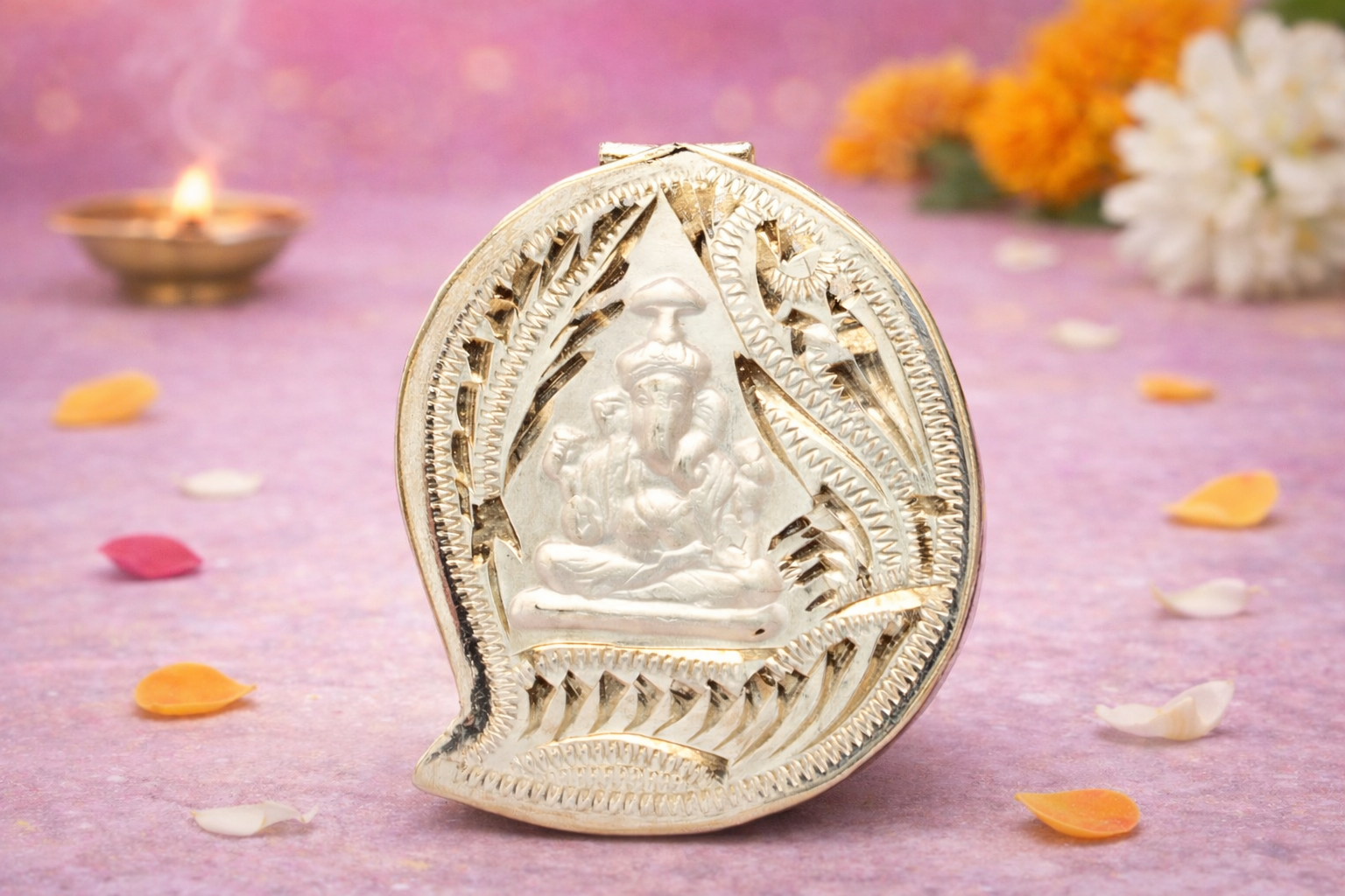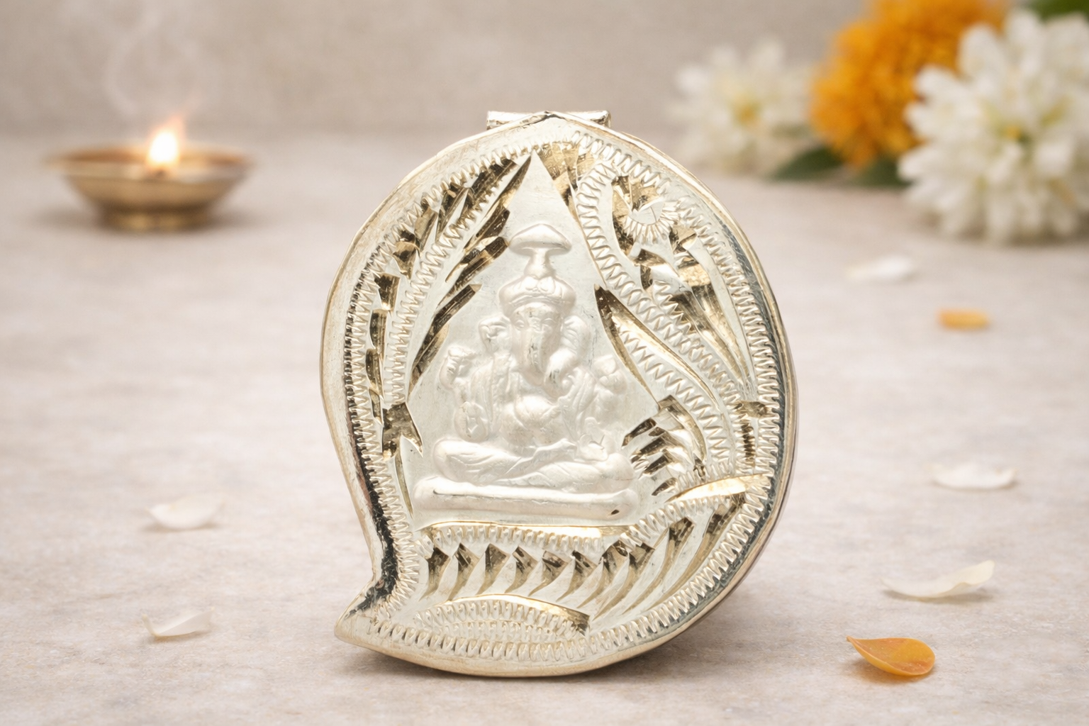 The Koyri B Silver Dabi is a finely crafted religious accessory featuring a sacred depiction of Lord Ganesha enclosed within an intricately engraved paisley-inspired frame. Designed with traditional motifs and balanced proportions, this dabi reflects classic Indian religious artistry while maintaining a clean and refined appearance suitable for ritual use.