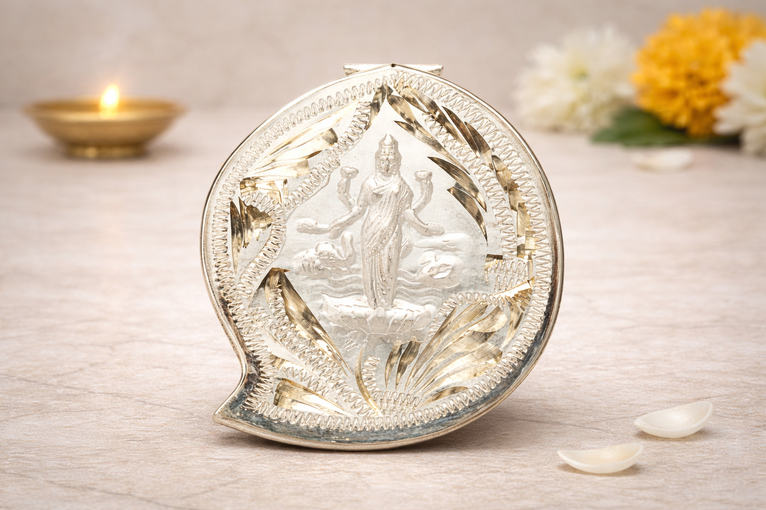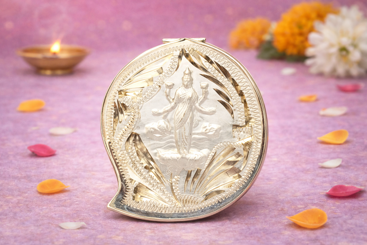 The Koyri C Silver Dabi is a traditionally crafted religious piece featuring a sacred depiction of Goddess Lakshmi, symbolising wealth, prosperity, and divine abundance. Encased within an intricately engraved paisley-style frame, the design reflects classical Indian metal artistry with fine detailing and balanced proportions suitable for ritual use.