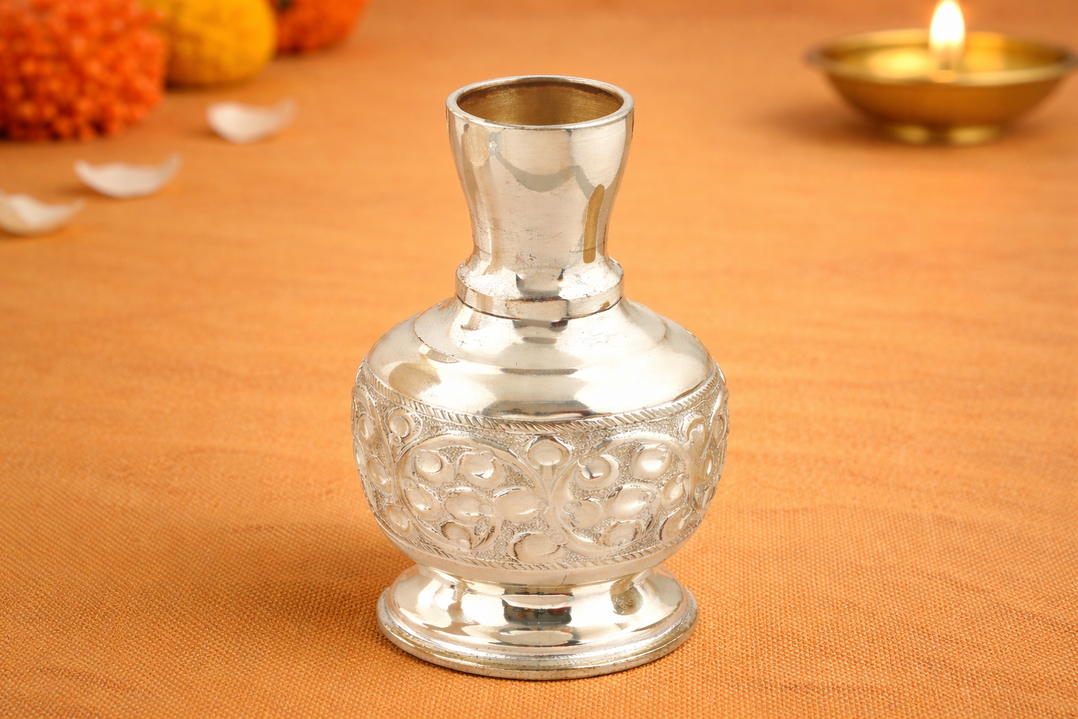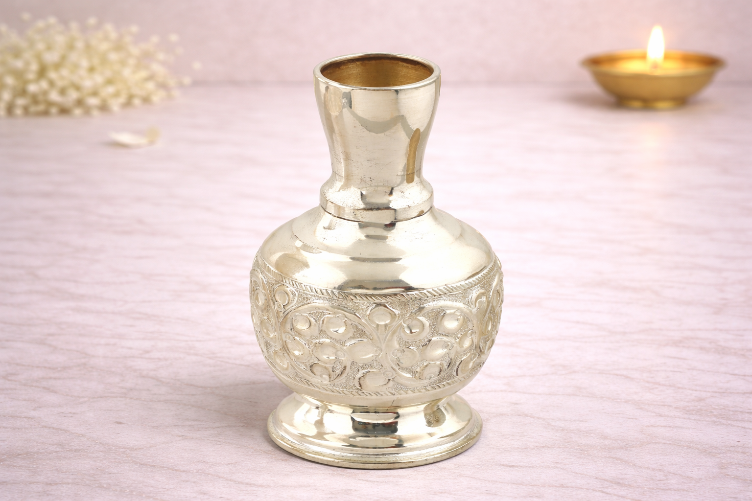 Made from 19KT silver, this kunja features an elegant, rounded body with a narrow neck and detailed handcrafted embossing that reflects timeless antique silver artistry. The naturally polished finish preserves the authentic character of silver without artificial enhancement, giving it a heritage-inspired appearance. Its balanced form ensures ease of handling while maintaining durability for regular ceremonial or display use.