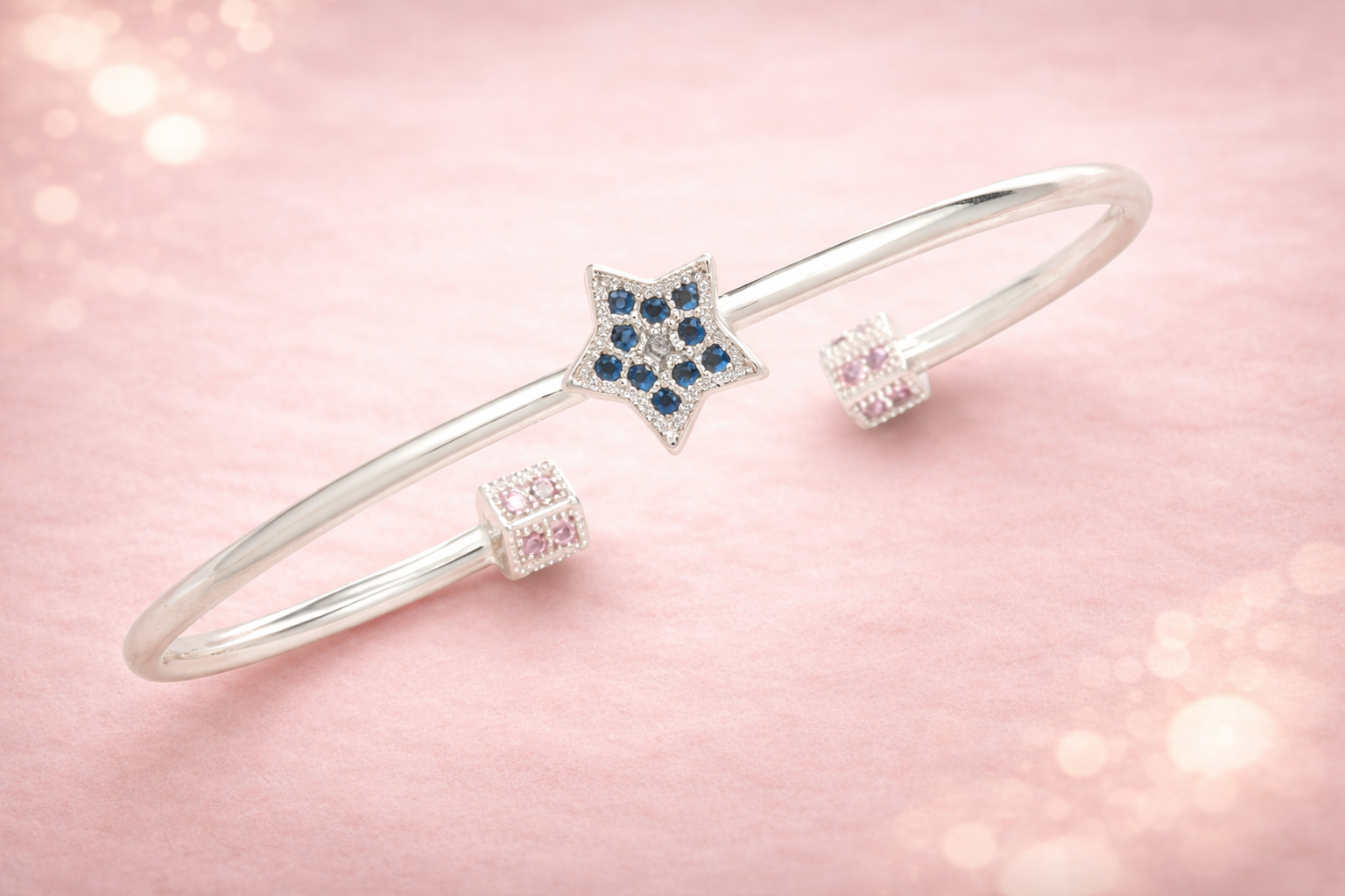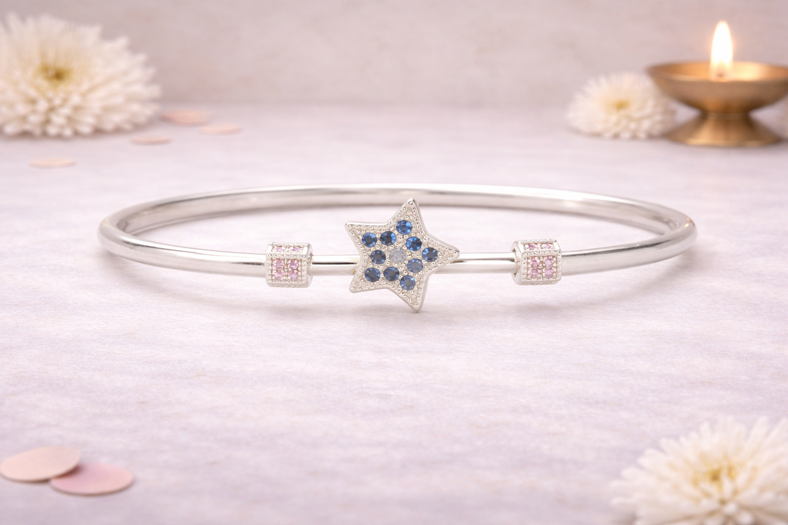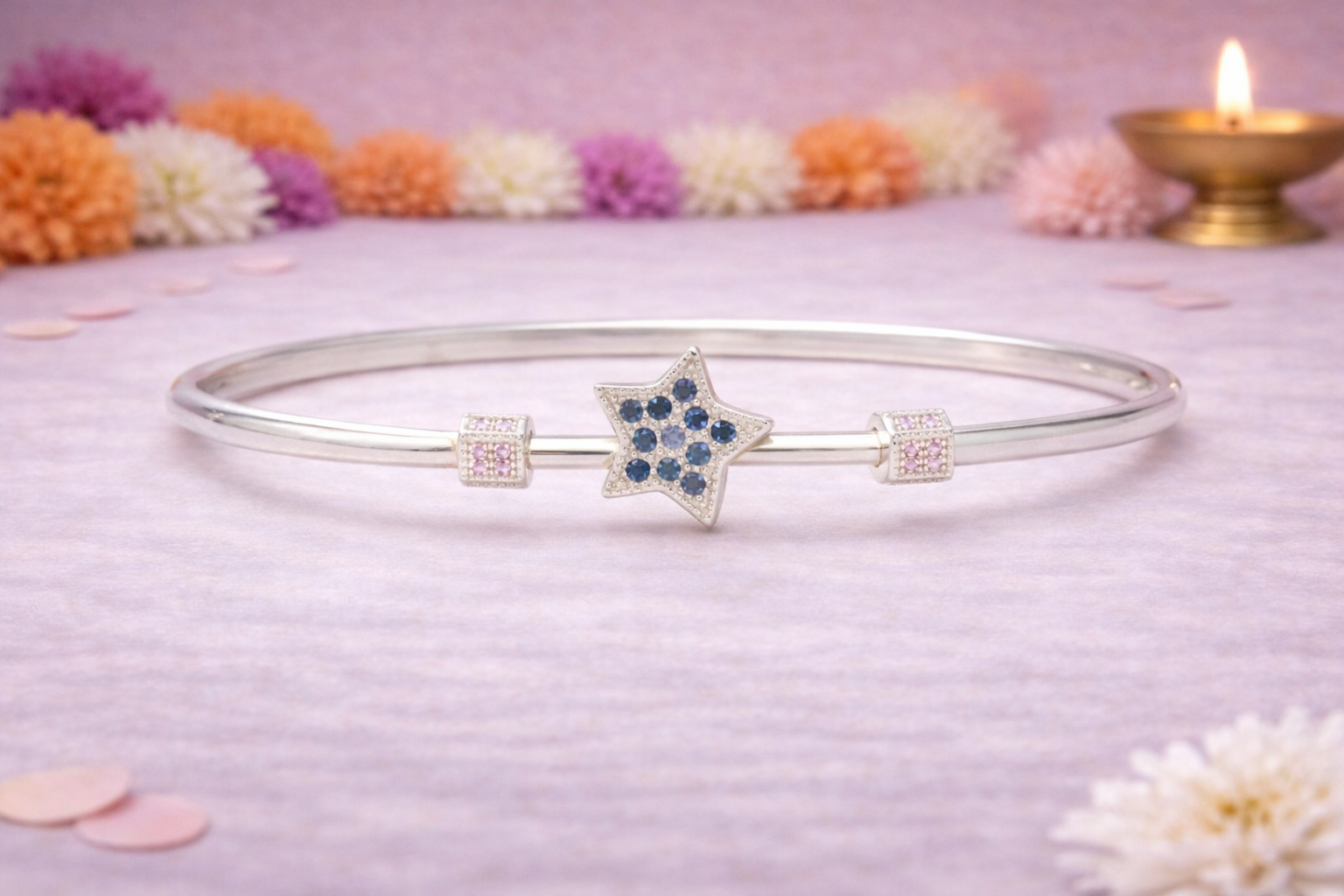The Ladies Kada 3 Silver Kada from the Women’s Collection is a charming and contemporary piece designed to add a touch of elegance and playfulness to everyday styling. Featuring a sleek silver band adorned with a finely crafted star-shaped motif accented with delicate stone detailing, this kada reflects modern design with graceful finesse.
