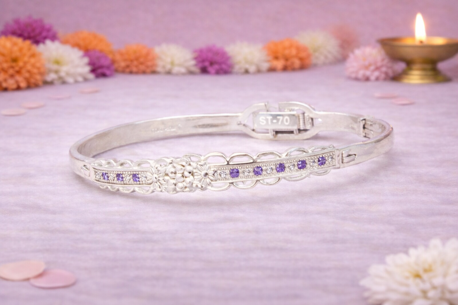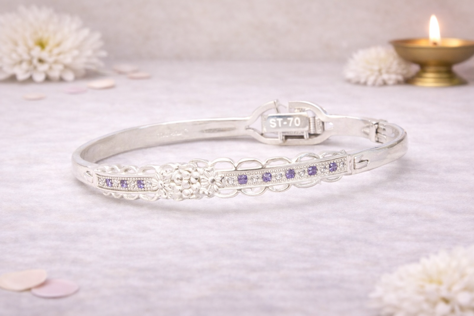 Crafted in 16KT silver purity, Ladies Kada 4 showcases a natural silver finish enhanced by finely set stones that add a gentle sparkle while preserving its classic character. The solid yet comfortable construction ensures durability and ease of wear, making it suitable for festive occasions, traditional functions, or elegant everyday styling.