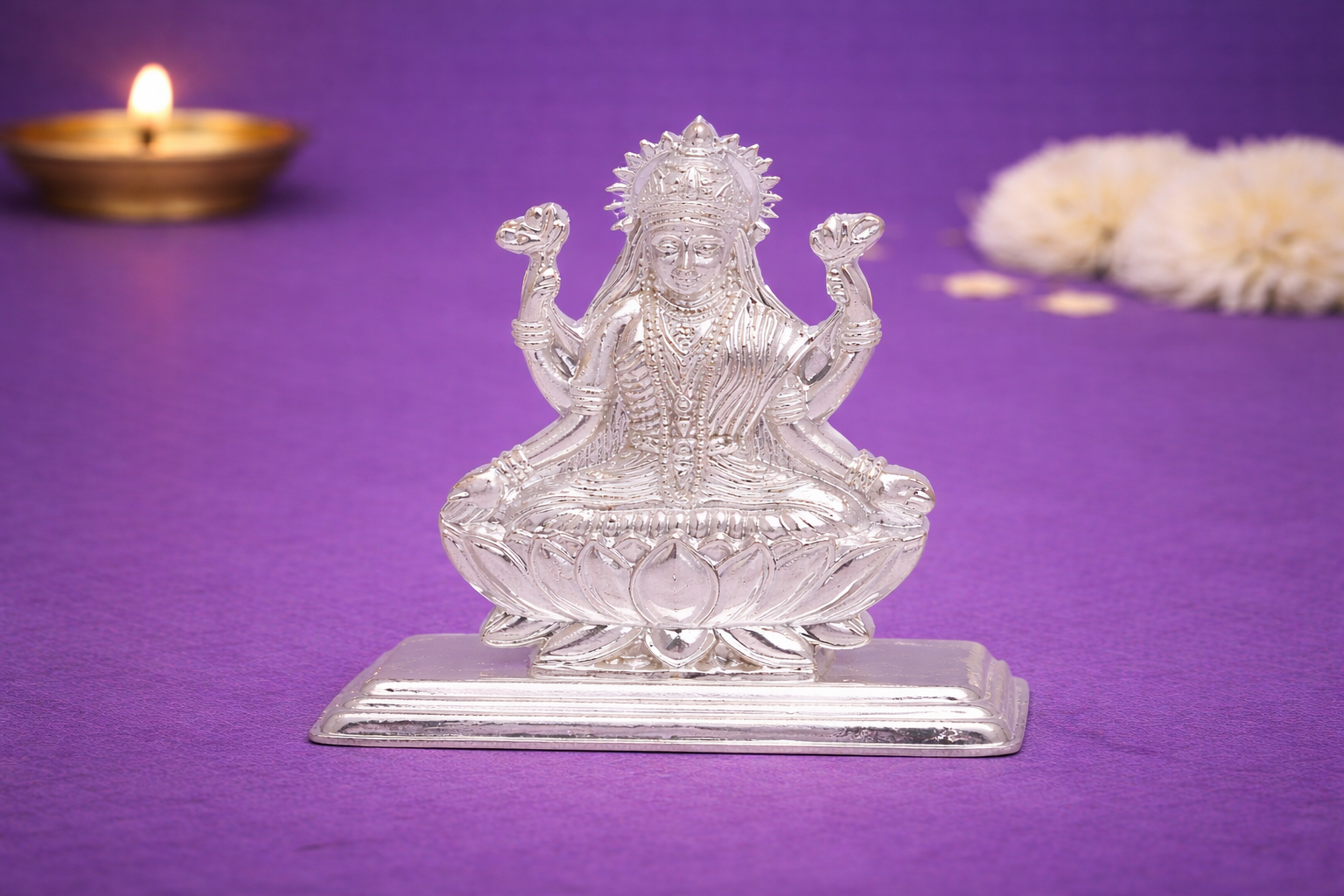 Crafted using the casting technique, this idol features refined facial expressions, balanced proportions, and intricate traditional detailing across the attire, lotus pedestal, and ornaments. Made in 16KT silver purity, it carries a natural silver finish with authentic metallic shine, preserving devotional sanctity without any artificial enhancement.