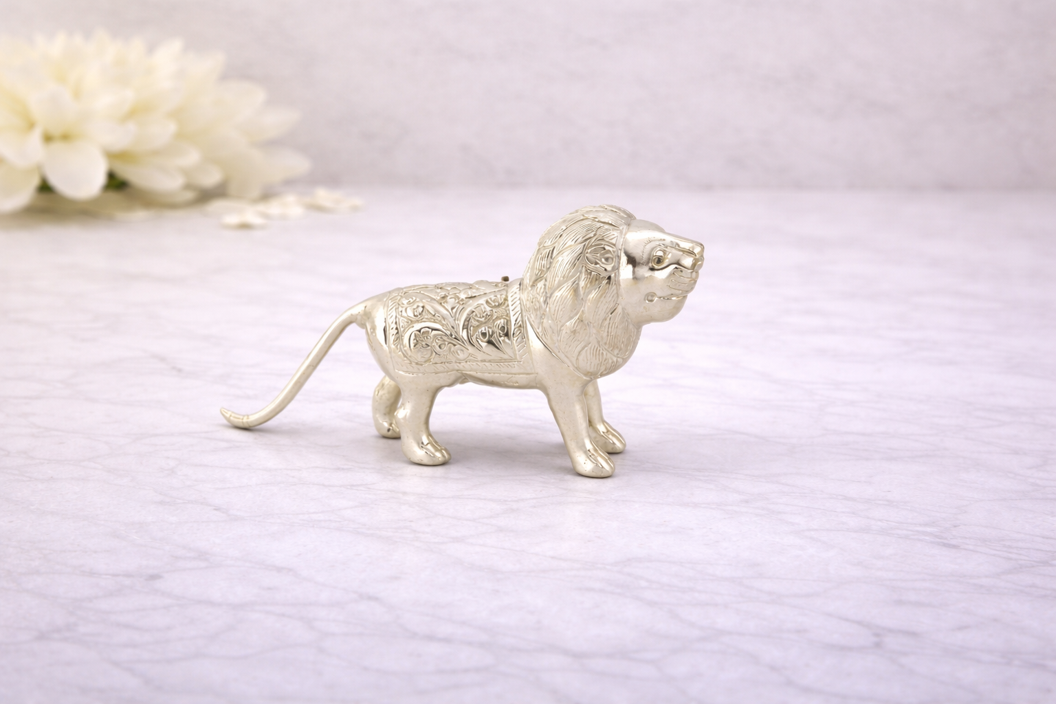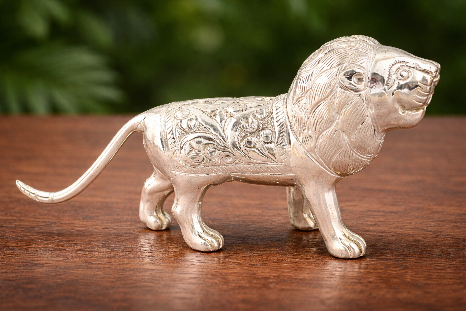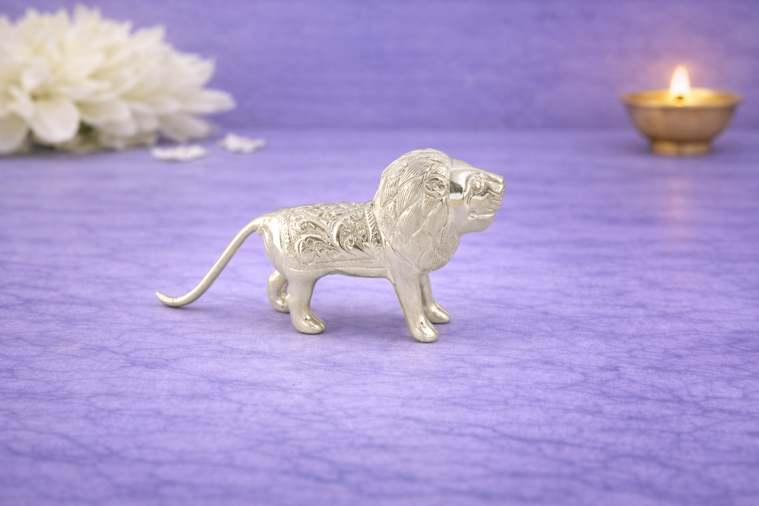The Lion Silver Idol is a finely crafted symbolic representation of strength, courage, authority, and divine protection. Revered in Indian tradition as a guardian figure and a symbol of power, the lion embodies fearlessness and stability. This piece features detailed craftsmanship across the mane, facial expression, posture, and body engravings, reflecting skilled traditional artistry in a compact yet impactful form.