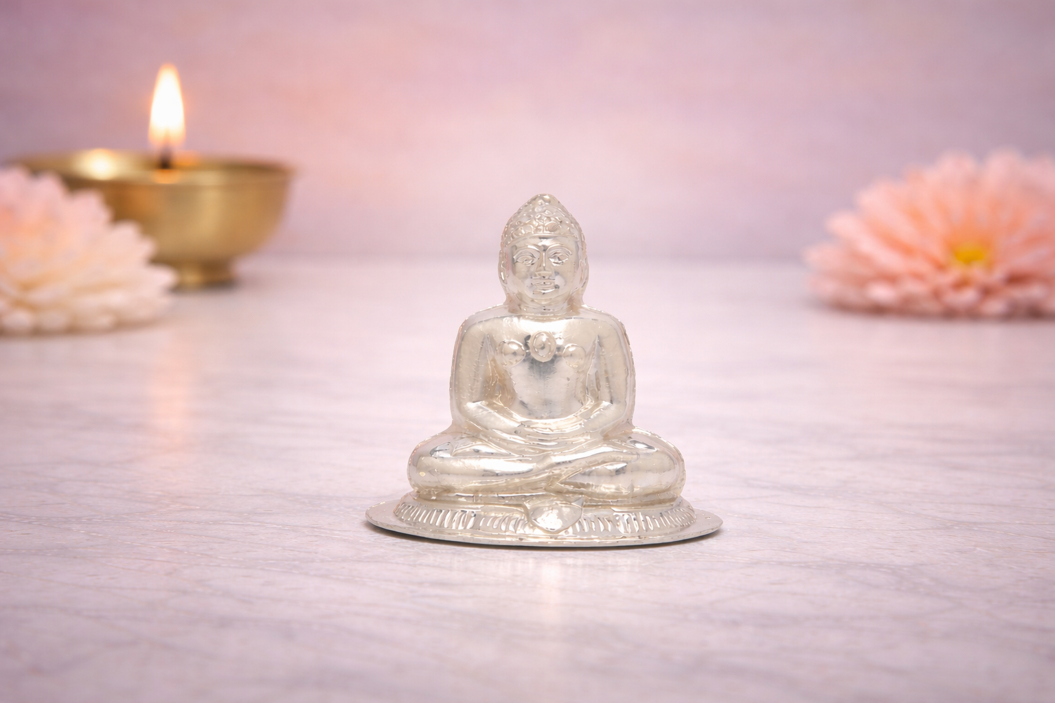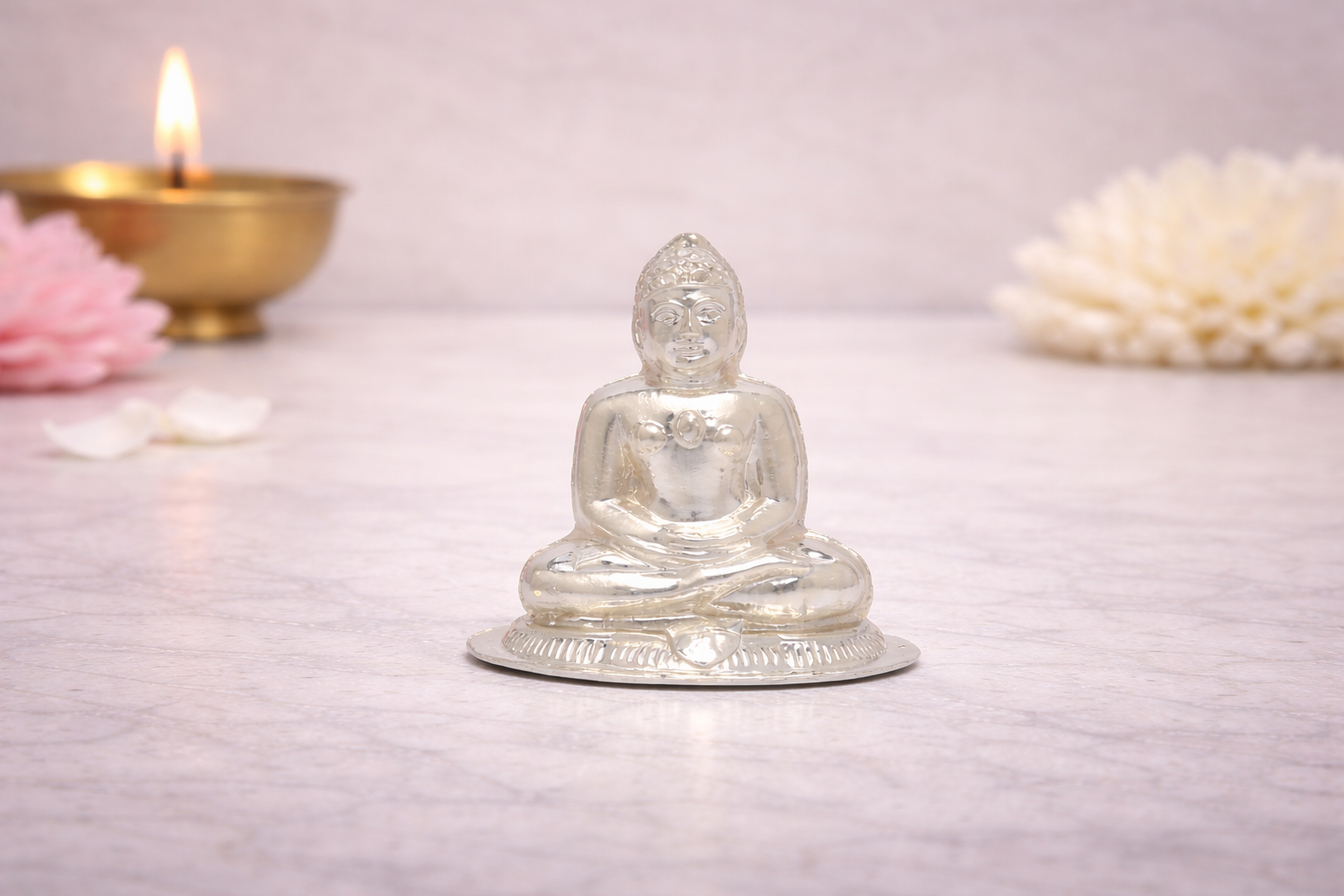Designed in 18KT silver purity, this hollow idol features a natural silver finish that preserves the authentic lustre of the metal while maintaining lightweight elegance. The hollow construction allows for larger visual presence across multiple weight options without compromising on detailing or stability, making it suitable for home mandirs, Jain temples, offices, or as a sacred gifting choice for religious occasions and ceremonies.