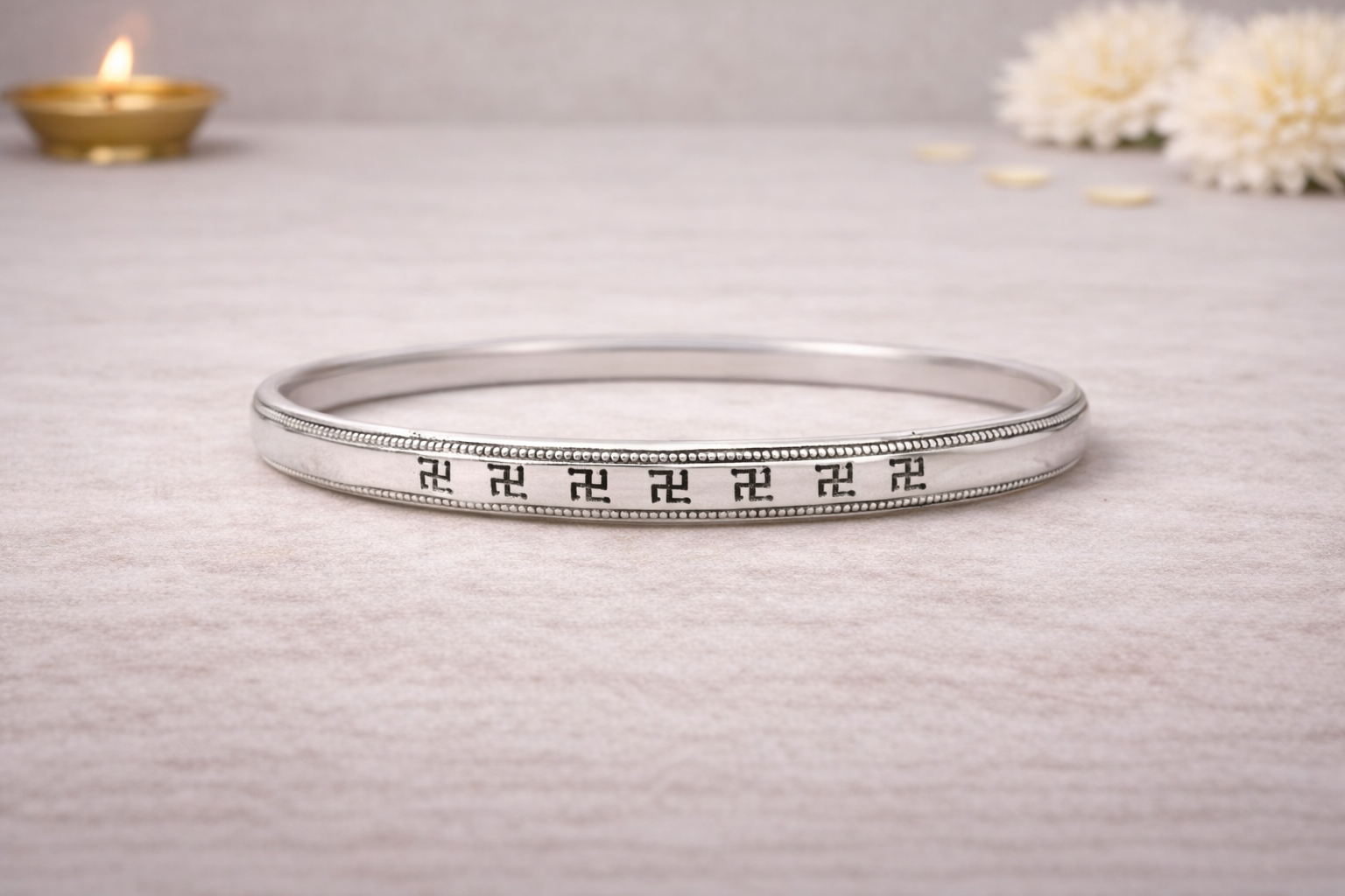 The Mens Kada D is a refined and spiritually inspired silver kada crafted for men who prefer minimal elegance blended with traditional symbolism. Designed with a continuous series of engraved sacred swastik motifs bordered by fine beaded detailing, this kada reflects positivity, protection, and timeless Indian heritage in a clean, masculine form.