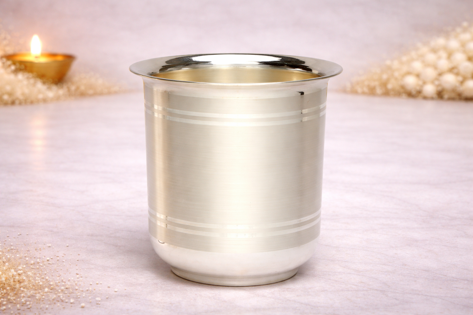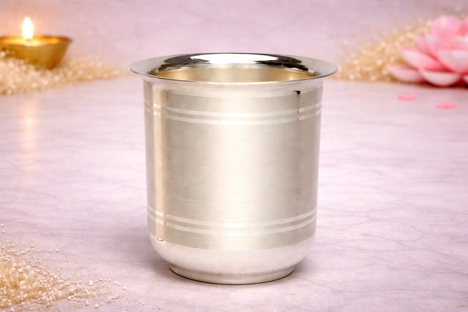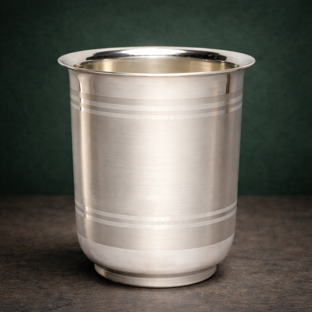 Its balanced proportions ensure a comfortable grip and stable placement, while the polished finish enhances its premium appeal. Ideal for homes that value tradition and quality, this silver glass is also a thoughtful choice for gifting on auspicious occasions. Available in multiple weight variants, it caters to both personal use and ceremonial requirements with ease.