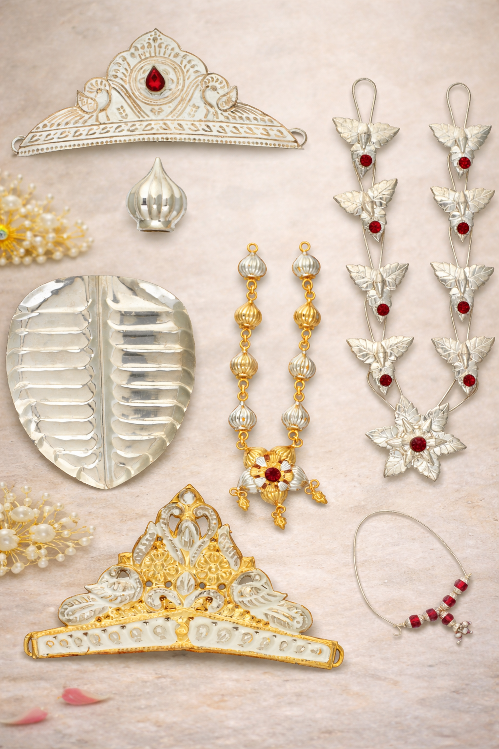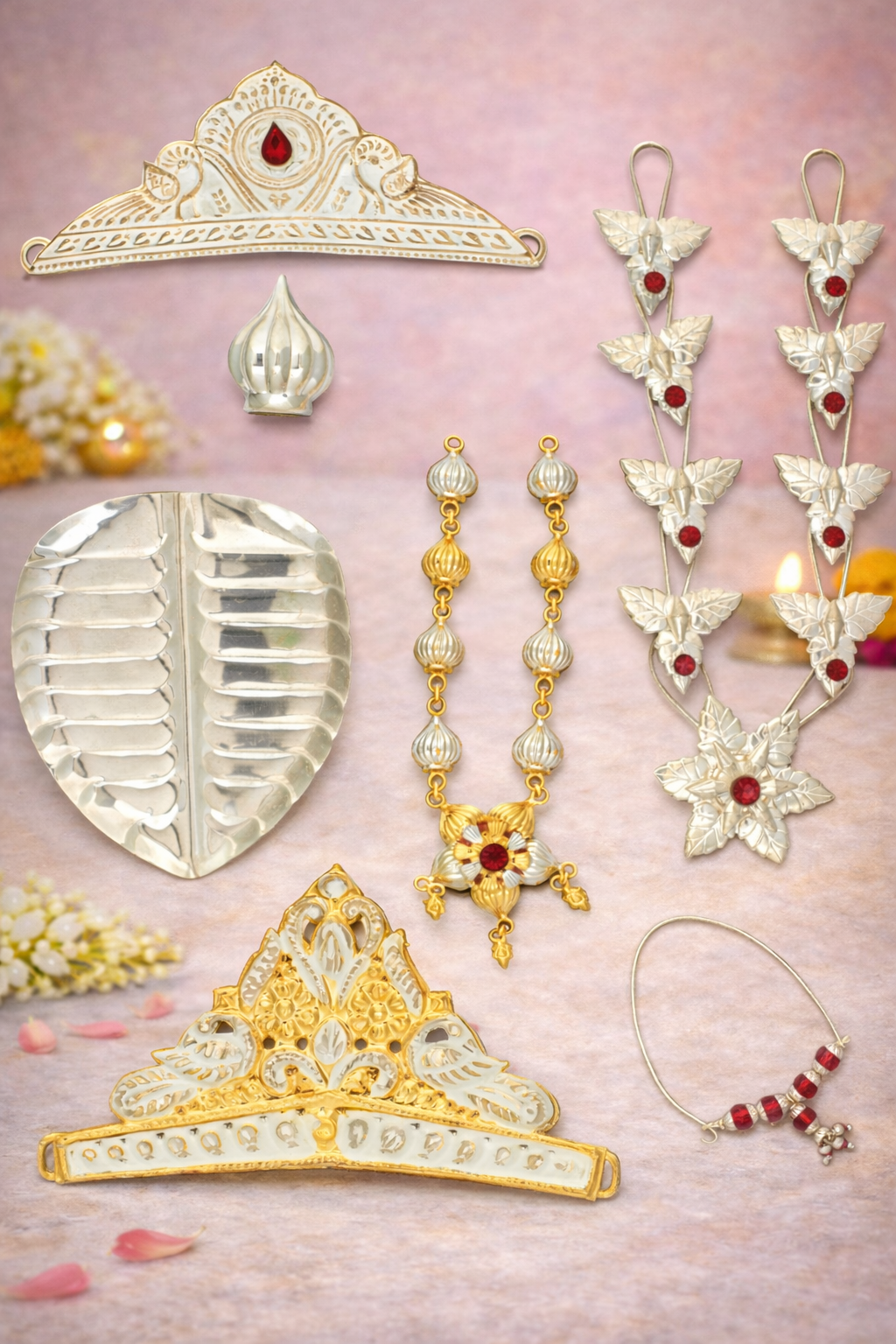 Designed in 16KT silver purity, the article features a natural silver finish complemented by refined accents that enhance its visual and devotional appeal. The balanced structure and intricate linking ensure ease of placement and graceful presentation during daily worship, festive rituals, and special religious occasions.