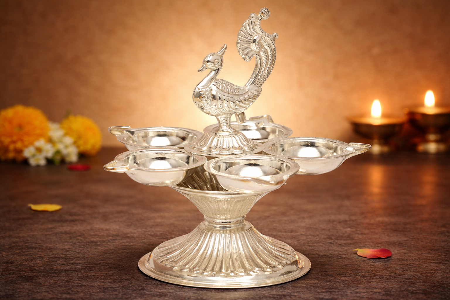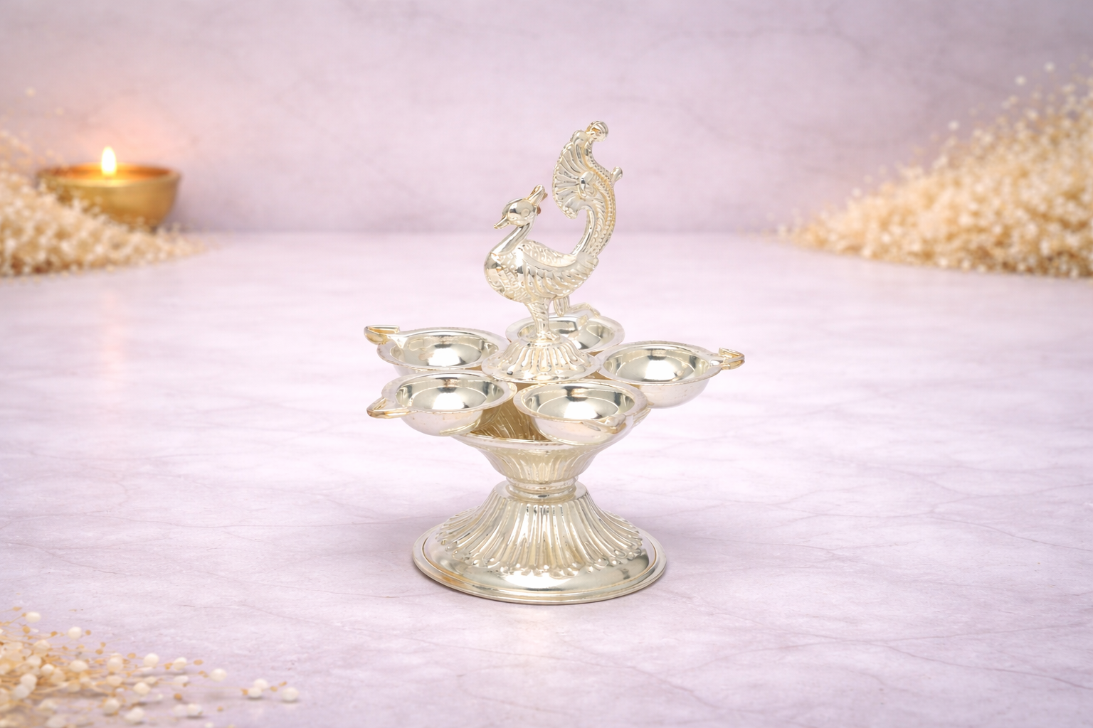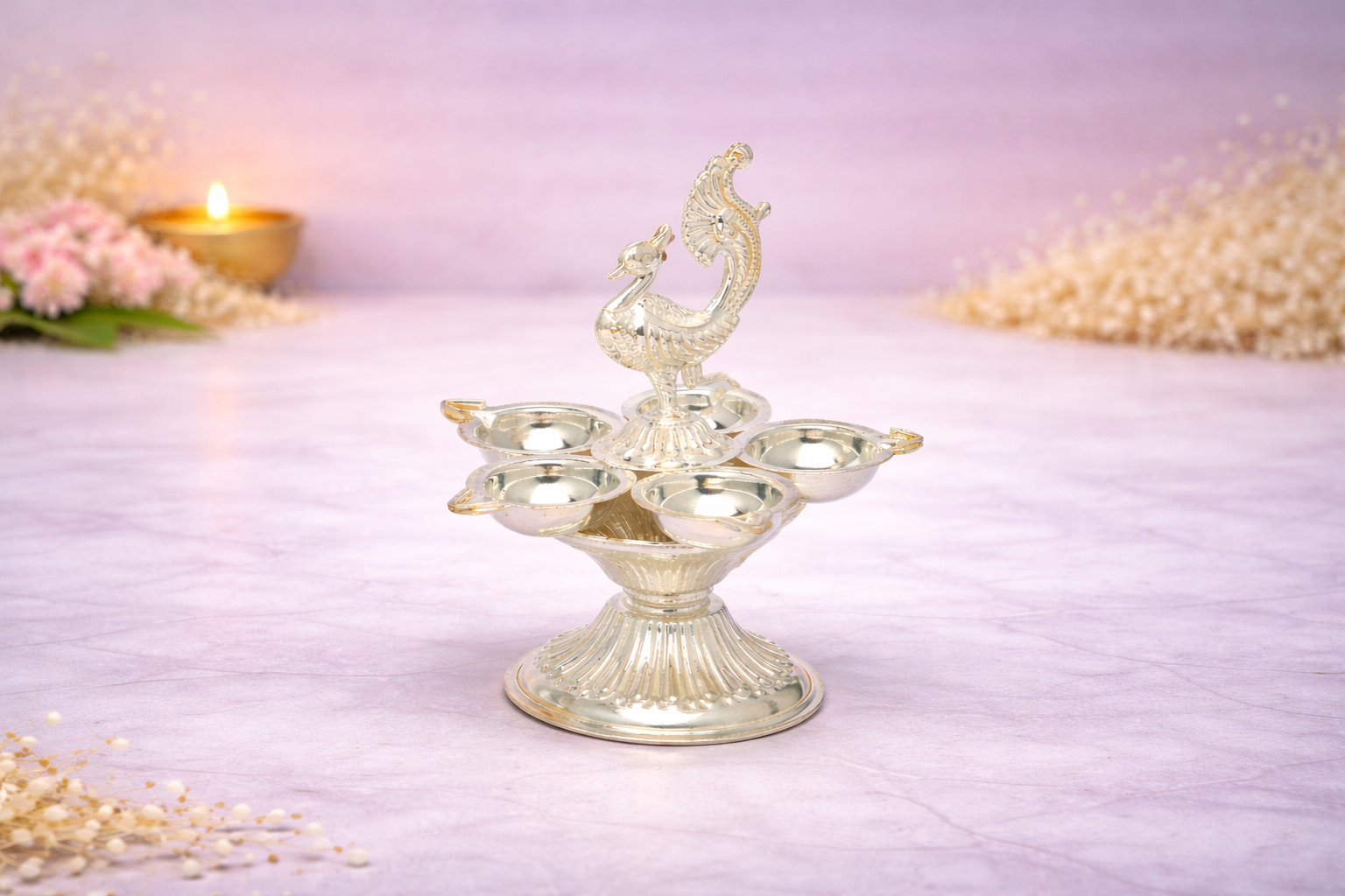 Designed to enhance spiritual spaces, the Mor Diva reflects superior craftsmanship, smooth finishing, and balanced proportions. Its refined design makes it suitable for homes, temples, gifting during festivals, weddings, housewarmings, and religious ceremonies. The sturdy base ensures stability, while the radiant silver finish adds divine brilliance to any altar or mandir.