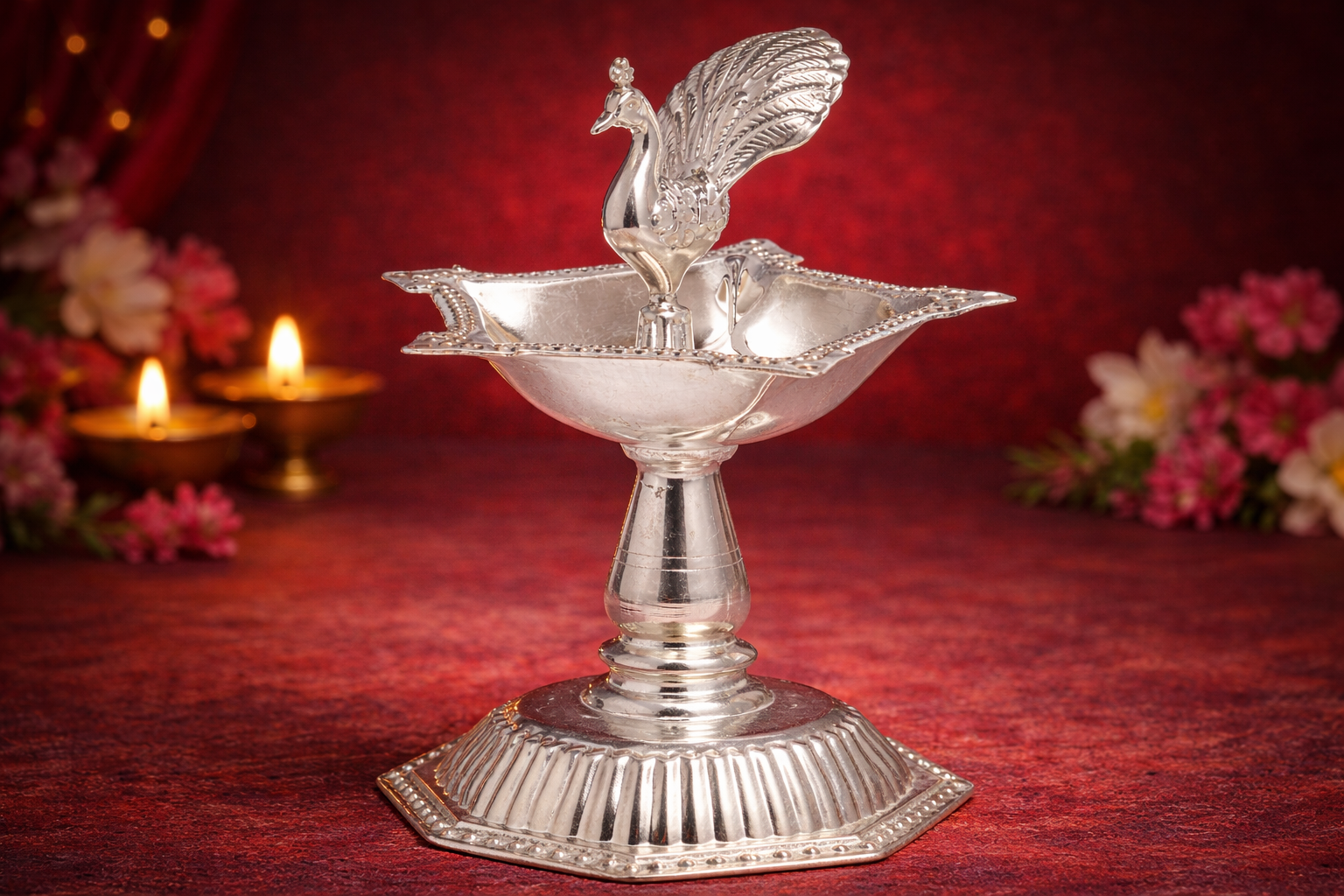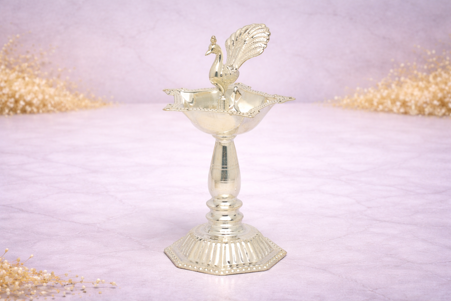 Crafted with precision from high-quality silver, the Mor Samai offers a stable, well-balanced structure with a smooth reflective finish. Its thoughtfully designed oil bowl ensures steady lighting, making it ideal for Diwali, Navratri, Lakshmi Poojan, griha pravesh, and regular spiritual practices. The elegant form and premium craftsmanship make it a timeless addition to home mandirs and a meaningful gift for religious occasions.